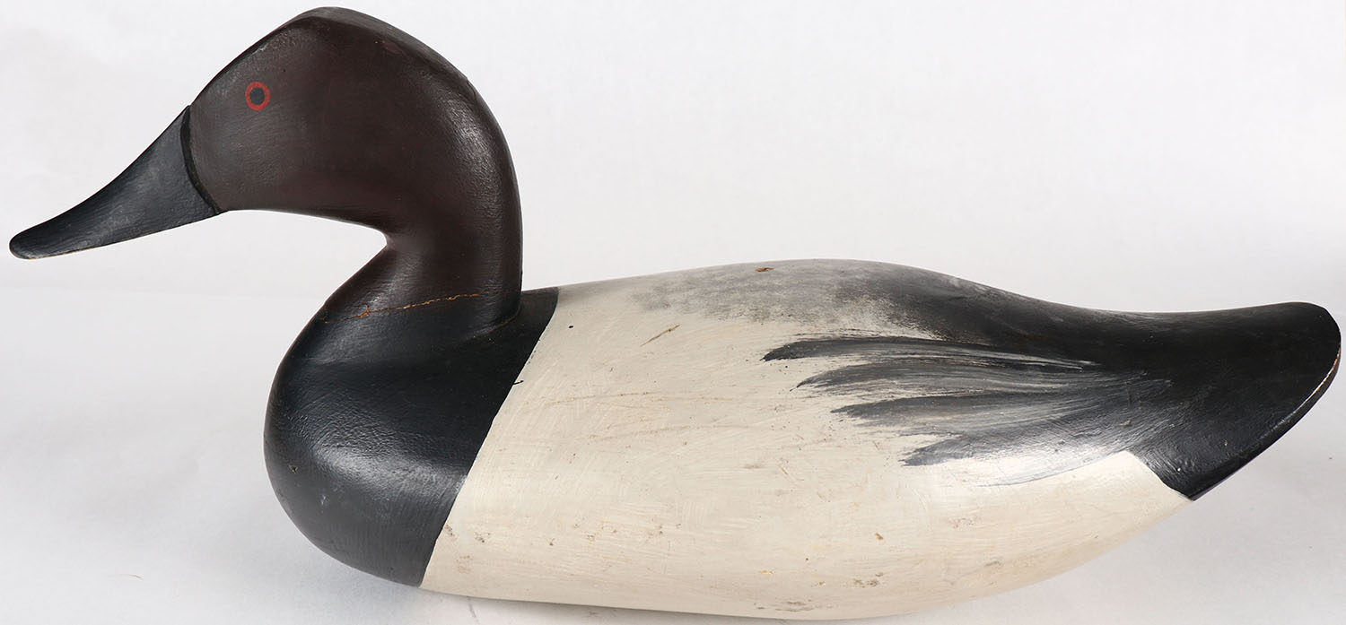 Canvasback Drake by Unknown MD carver, painted eyes, solid wood, original paint, structurally excellent except for hair line crack at neck, 16'' OAL. Grade: Excellent - Value: 30 to 60