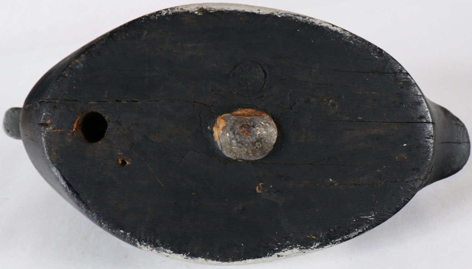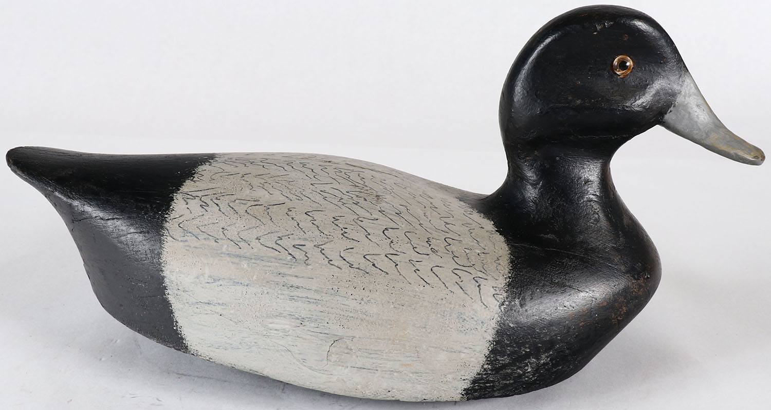 Bluebill Drake decoy by unknown carver, PE, solid wood, old repaint with crack repair to head, 13'' OAL. Grade: Very Good - Value: 20 to 40