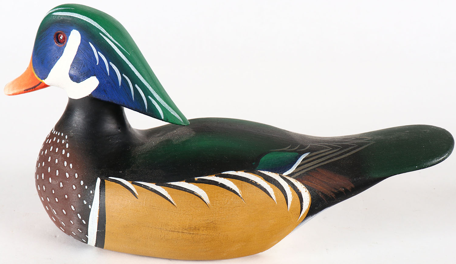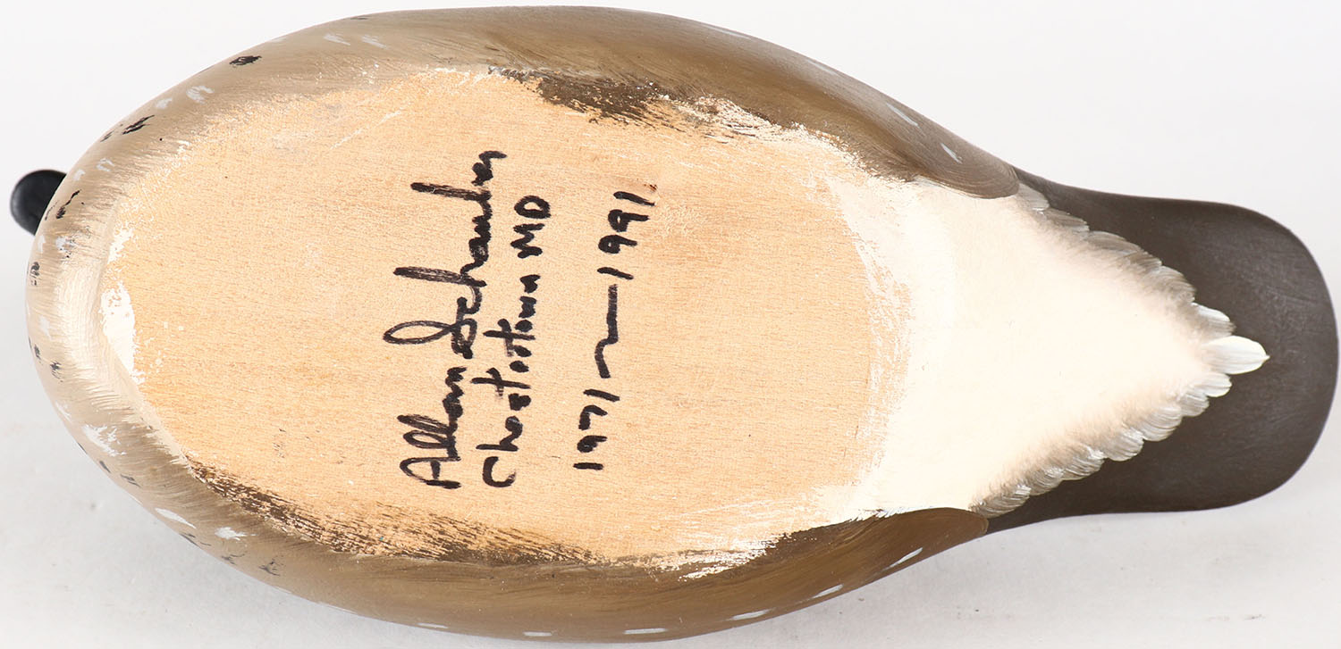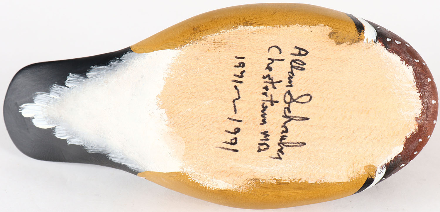 Pair of Miniature Woodducks by Allan Schauber of Chestertown MD, GE, solid wood, mint original paint, signed & dated on bottom, 8'' OAL. Grade: MINT - Value: 80 to 200