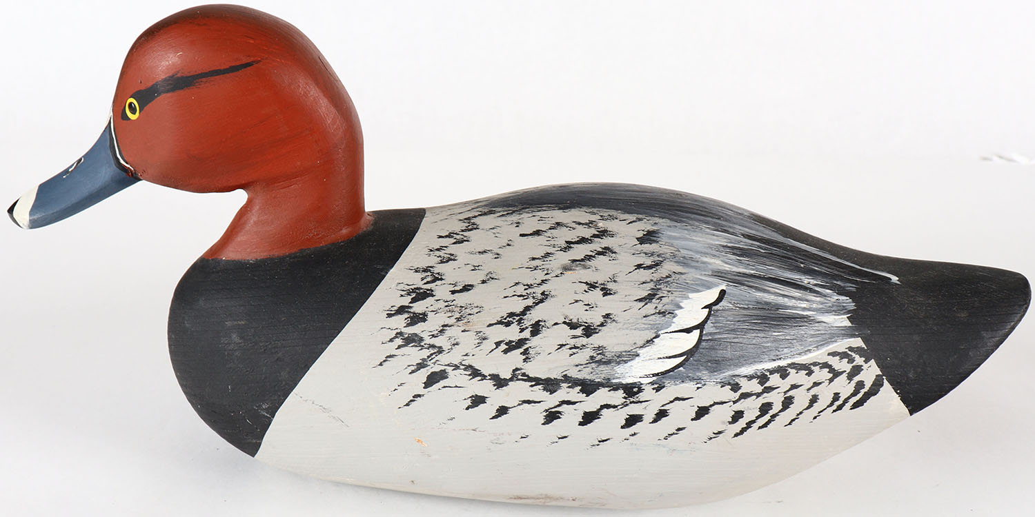 Redhead Drake by Nobel Gilbertson, Dover, DE, painted eyes, solid wood, original paint, structurally excellent, signed on bottom, 14'' OAL. Grade: Excellent ++ - Value: 30 to 60