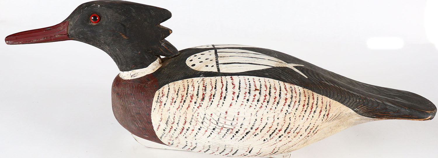Hooded Merganser by Charles Fish, Chincoteague, VA, ''FROM MY HUNTING RIG'', GE, solid wood, nice original paint. Grade: Excellent - Value: 100 to 400