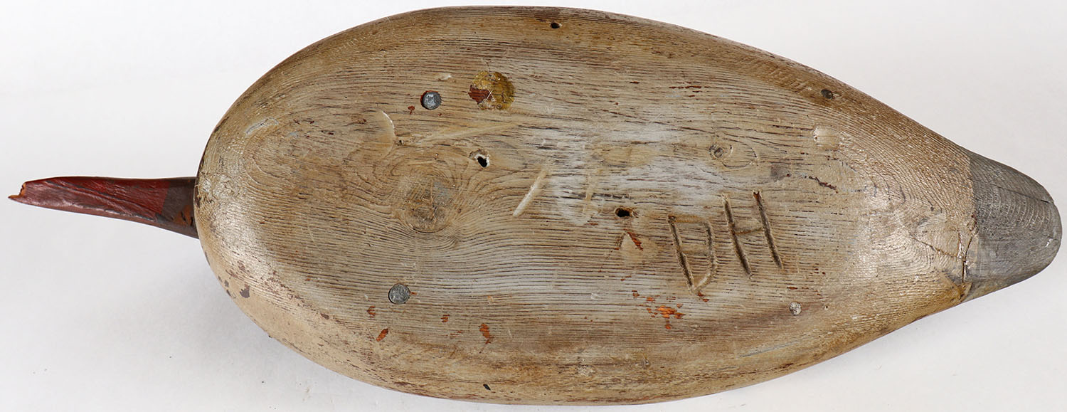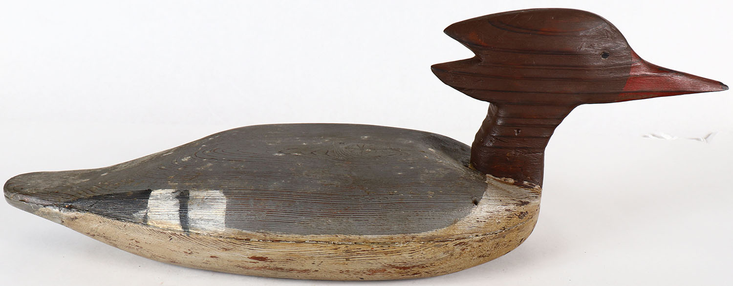 Hooded Merganser by unknown carver, TE, solid wood, nice original paint, has repaired neck. Grade: Very Good - Value: 10 to 30
