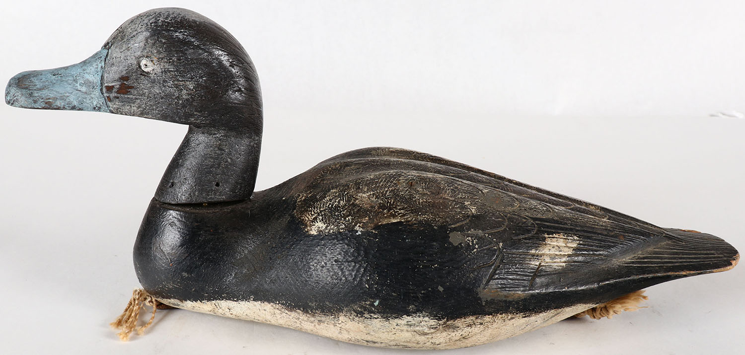 Bluebill Drake by unknown maker, PE, solid wood, original paint, structurally excellent, has feather carvings. Grade: Excellent - Value: 10 to 30