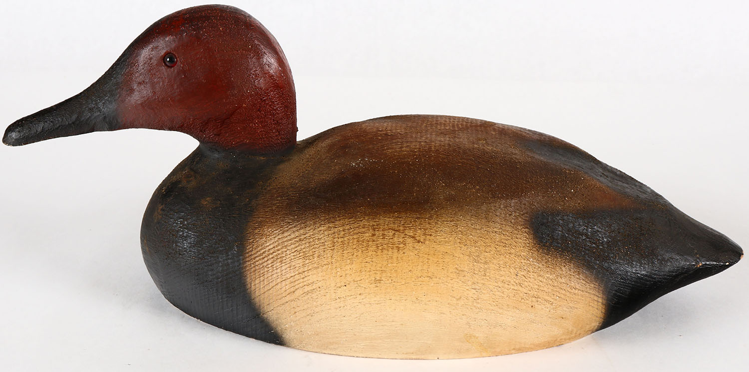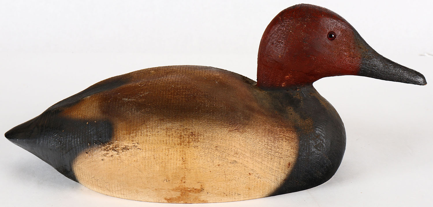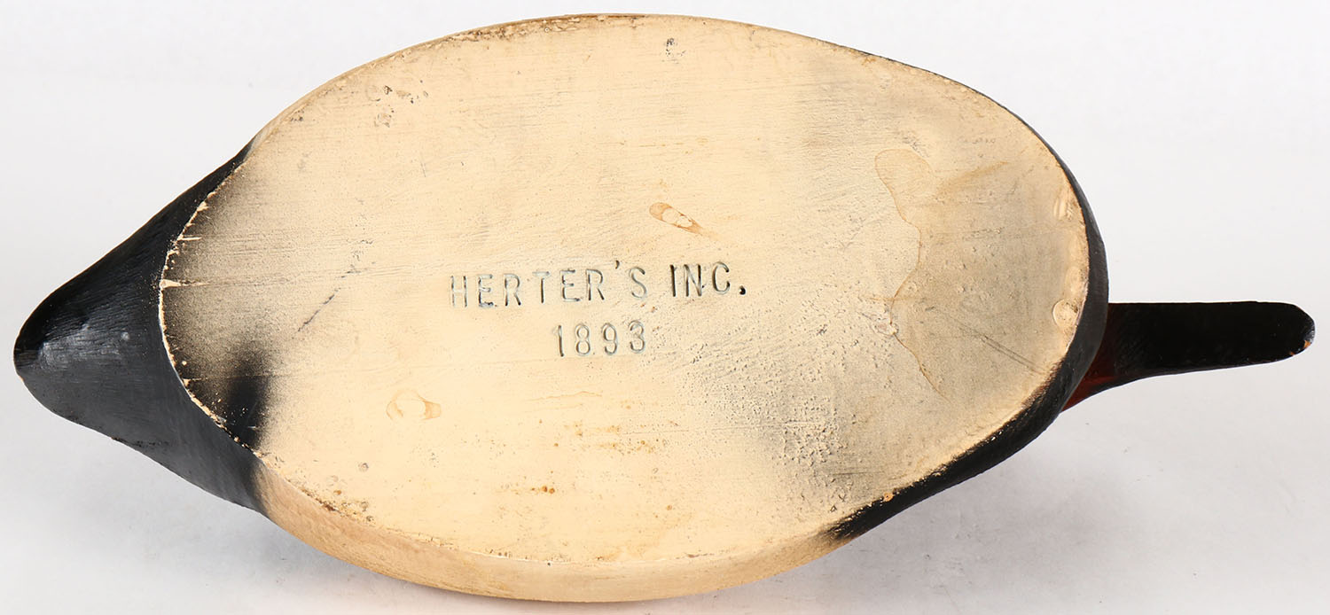 Canvasback Drake by Herters Decoy Co., Waseca, MN, 1893 series, glass eyes, solid wood, original paint, structurally excellent, marked on bottom. Grade: Excellent ++ - Value: 50 to 100