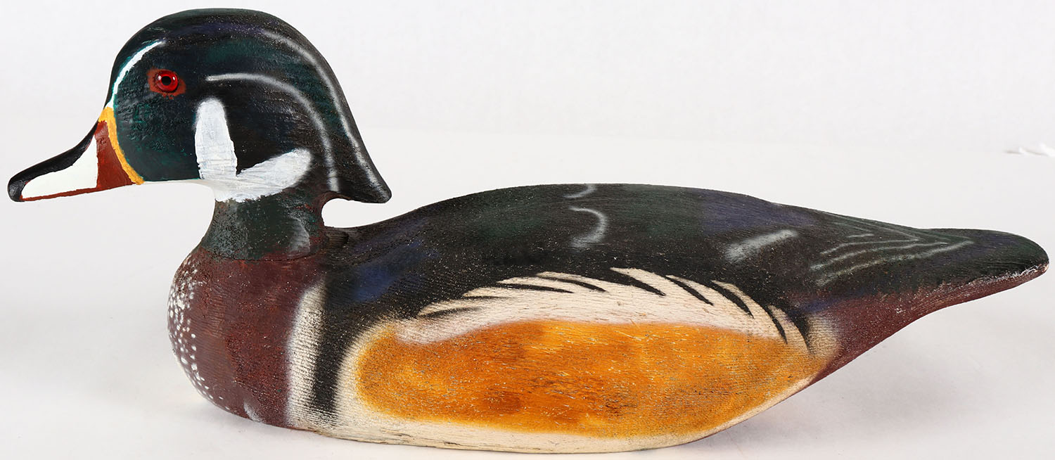 Woodduck Drake by Herters Decoy Co., Waseca, MN, 1893 series, glass eyes, solid wood, original paint, structurally excellent, unmarked on bottom. Grade: Excellent ++ - Value: 40 to 100