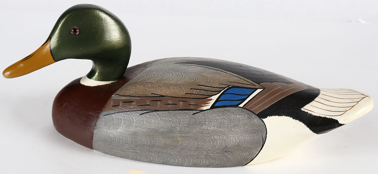 Mallard Drake by Wildfowler Decoy Co. Babylon NY, GE solid wood, orignal paint, stamped on bottom. Grade: Excellent ++ - Value: 20 to 40
