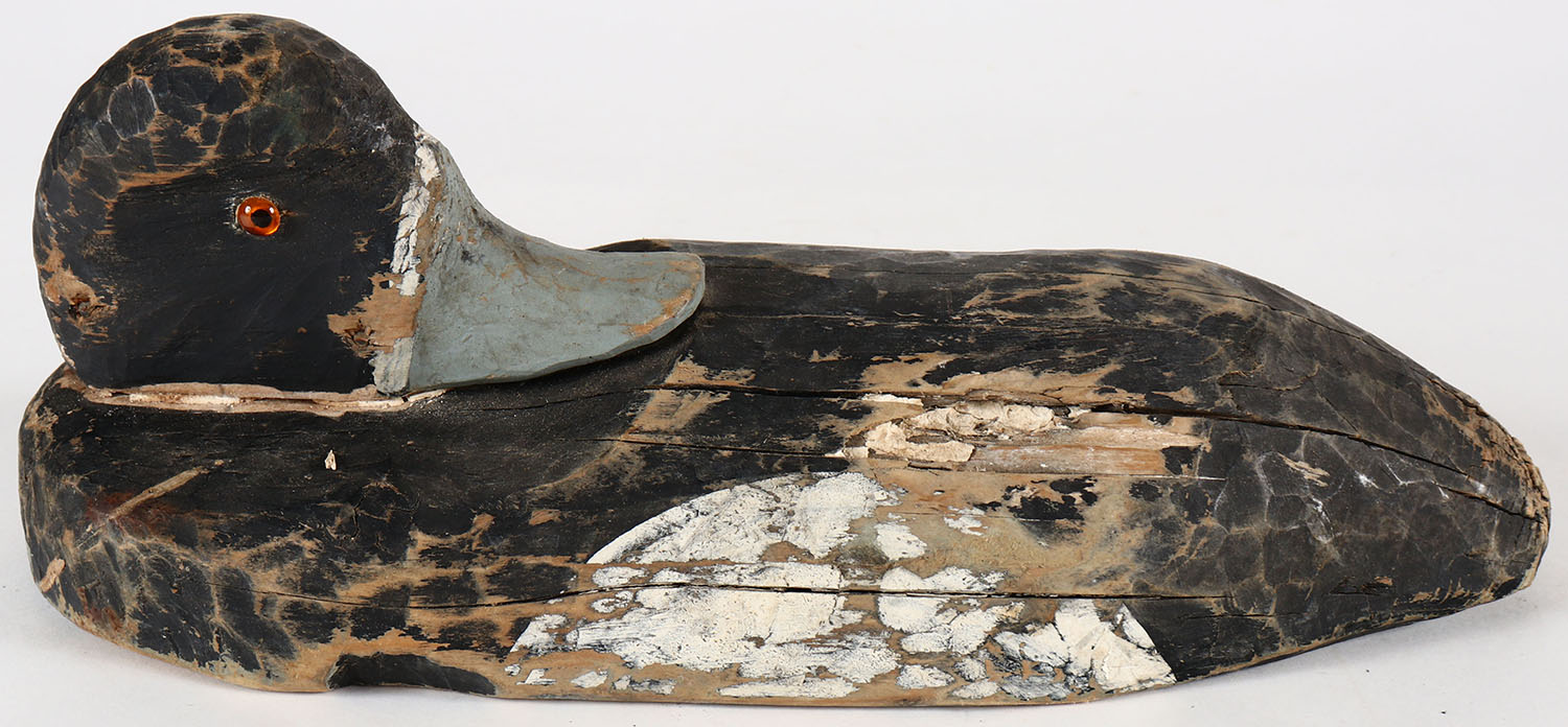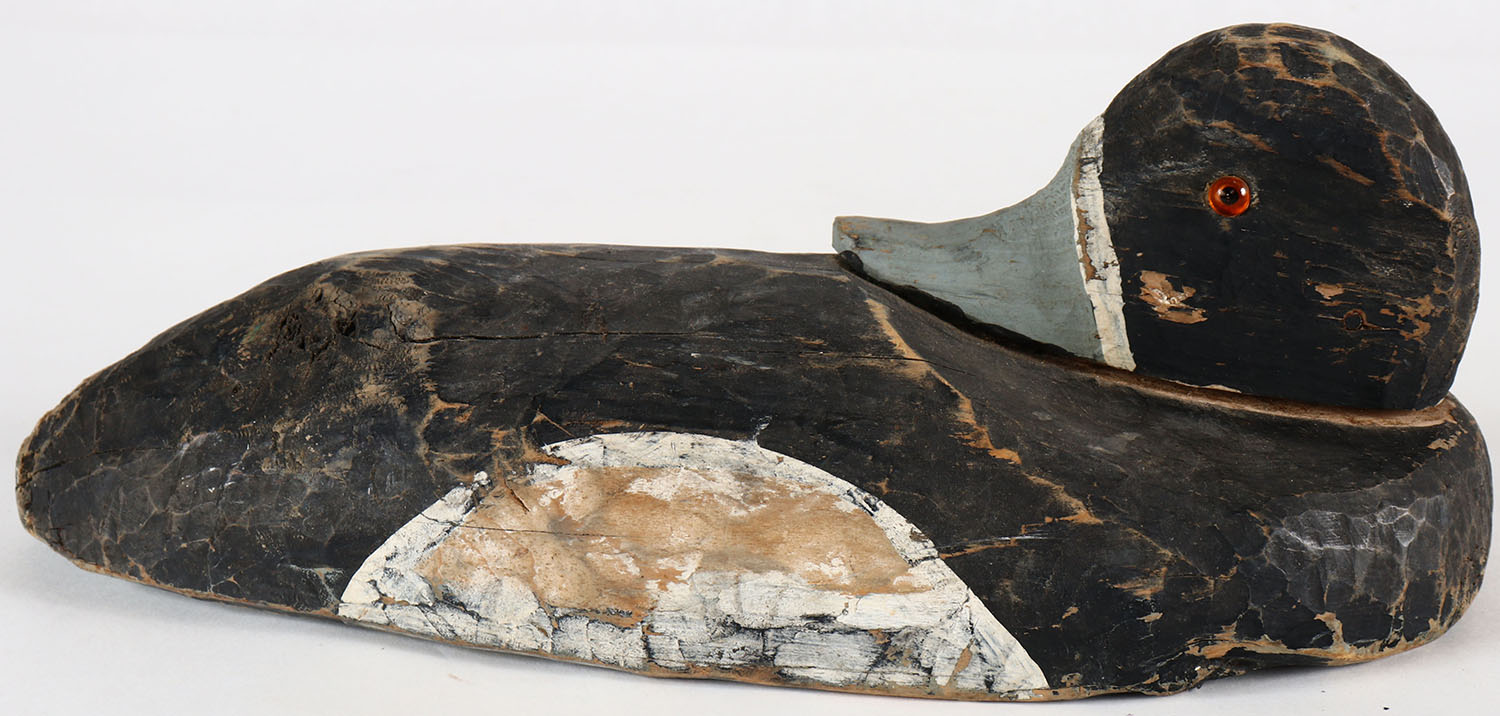 Preening Bluebill Drake by unknown maker, GE, solid wood, original paint. Grade: Very Good ++ - Value: 20 to 40