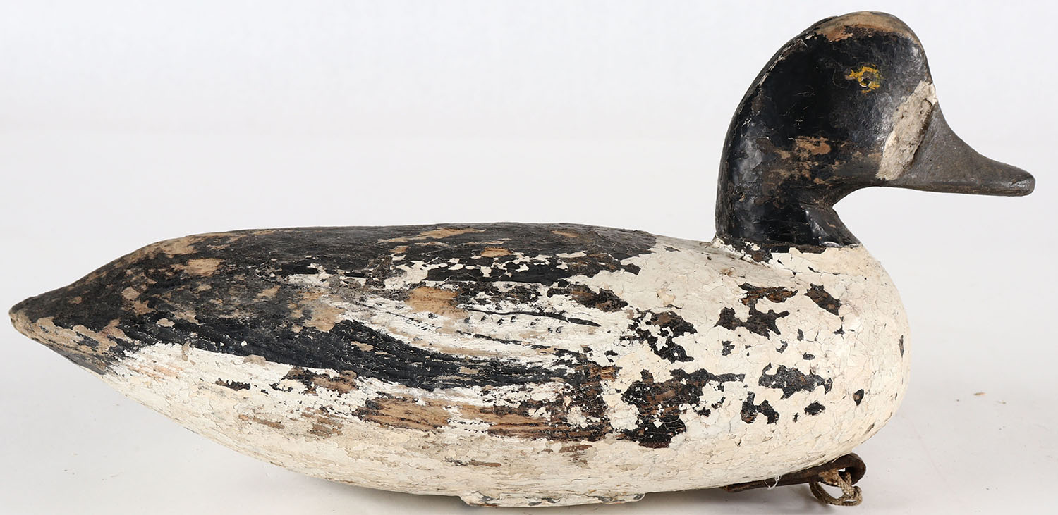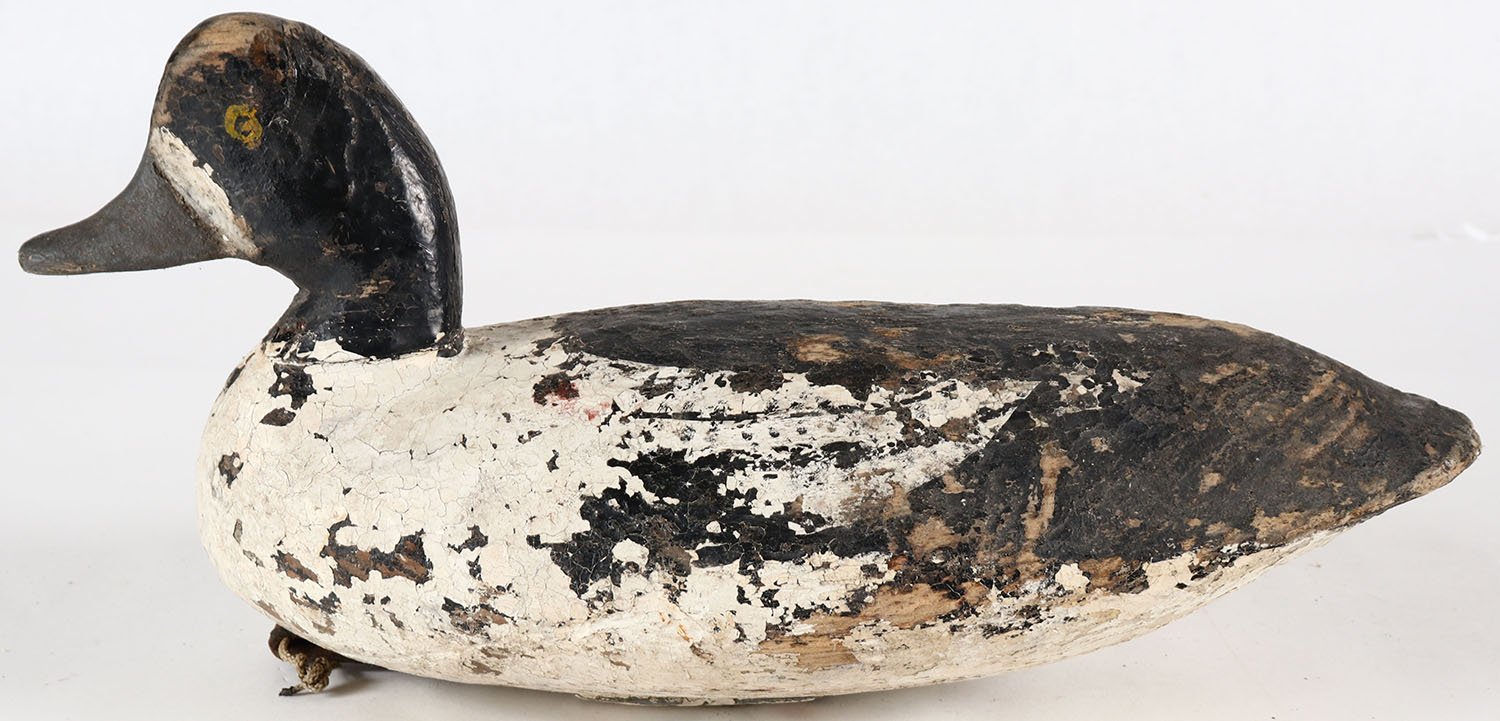 Bluebill Hen attributed to Doug Jester, Chincoteague, Virginia, PE, solid wood, old repaint, shows wear, structurally excellent. Grade: Very Good - Value: 26 to 50