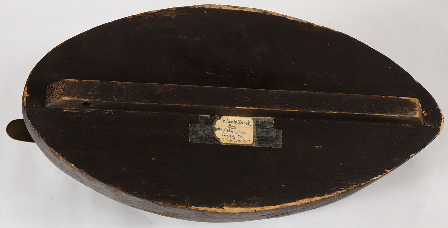 Black Duck by Wildfowler Decoy Co., Old Saybrook, CT, GE, Solid wood, no stamp on bottom, original paint. Grade: Excellent - Value: 40 to 80