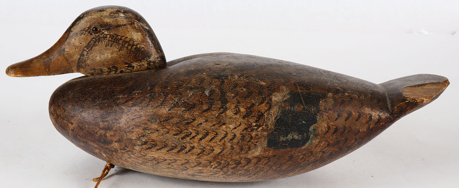 Mallard Hen by unknown carver, GE, solid wood, original paint, has old chip to tail. Grade: Very Good ++ - Value: 20 to 60