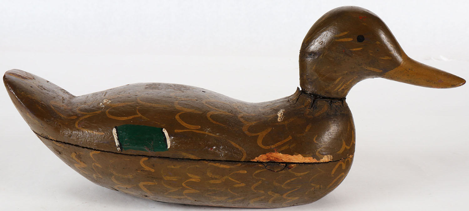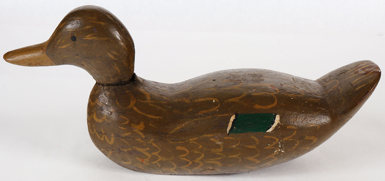 Mallard Hen by unknown maker, PE, solid wood, original paint, some neck filler missing. Grade: Excellent - Value: 10 to 30