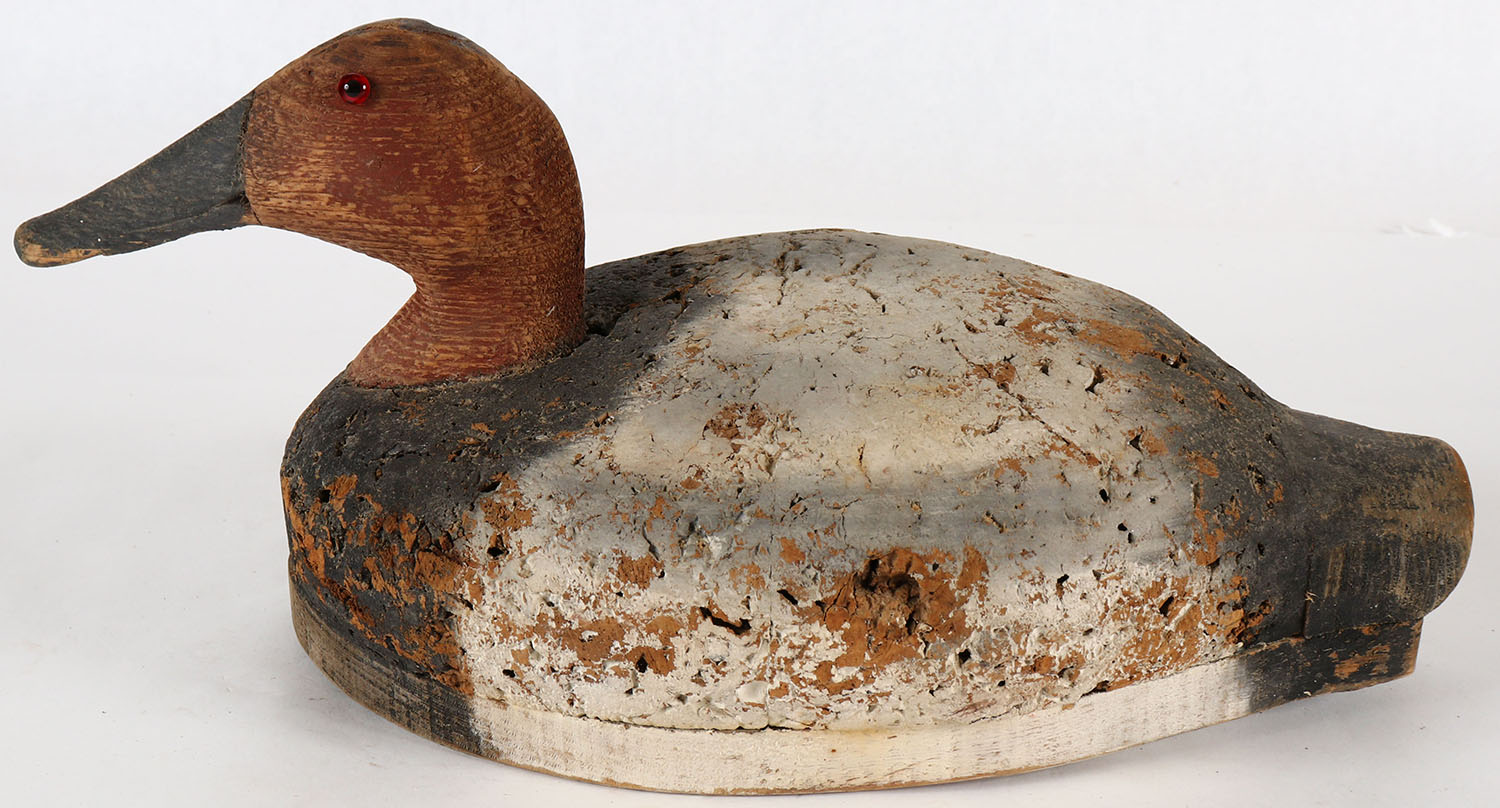 Canvasback Drake by unknown maker, glass eyes, solid cork body, wood head, original paint, structurally excellent. Grade: Very Good + - Value: 10 to 40