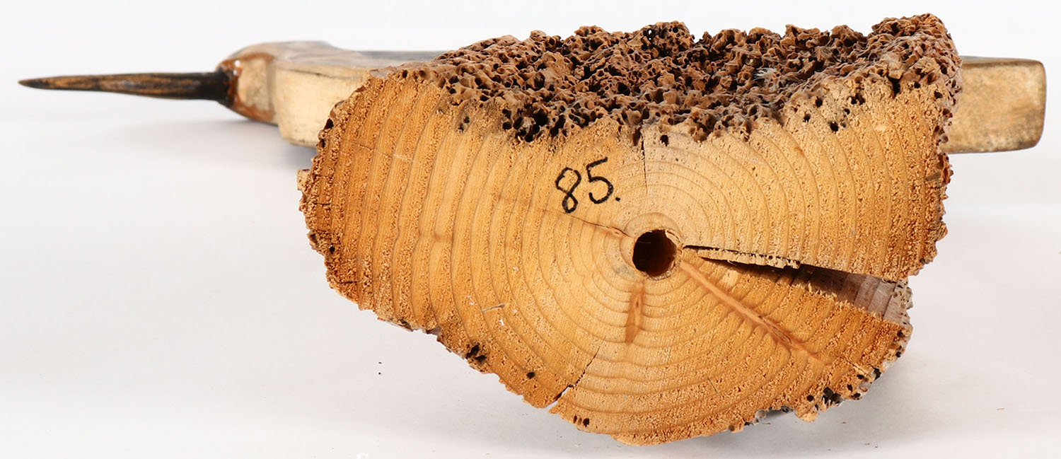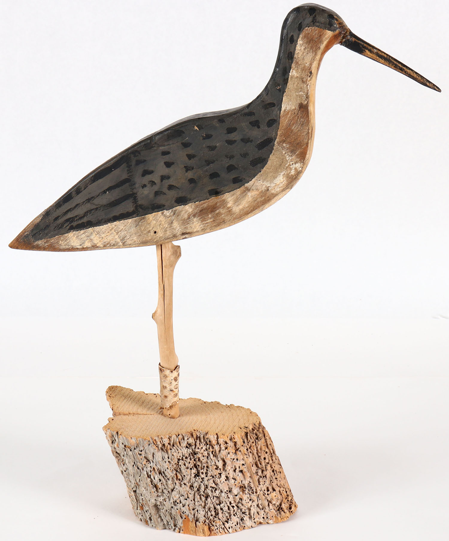 Shorebird by unknown maker, no eyes. Solid wood, original paint, on stand, 16'' tall. Grade: Excellent - Value: 20 to 40