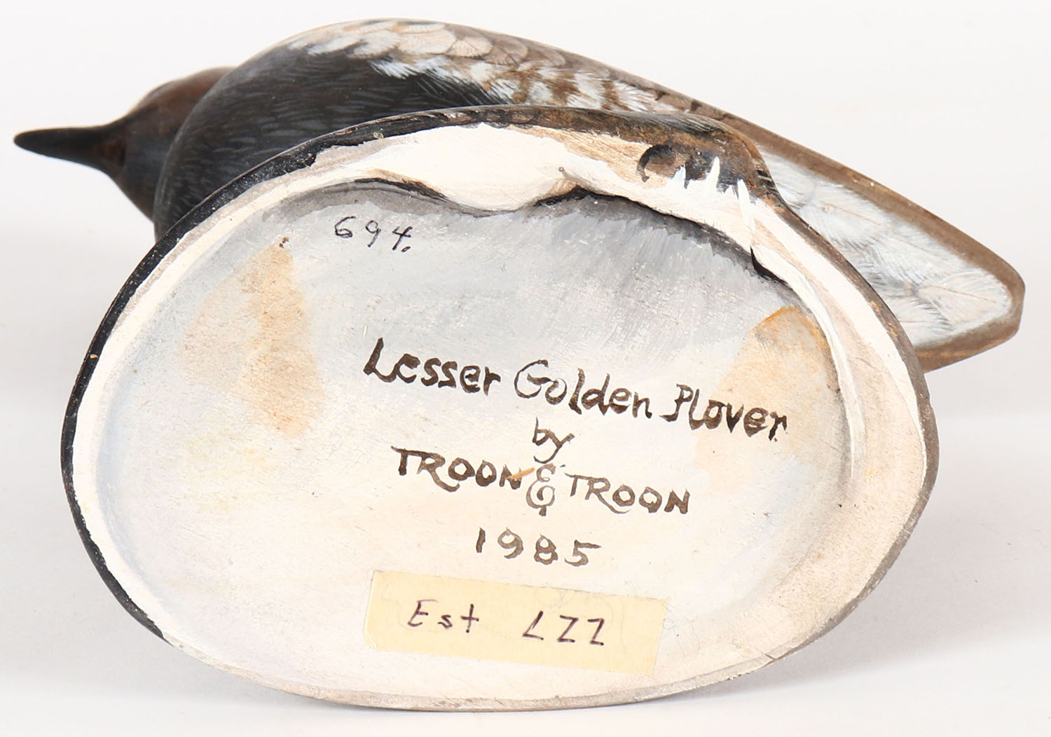 Lesser Golden Plover by Troon & Troon, circa 1985, PE, solid wood, mint original paint, marked on bottom of stand, 9 1/4'' tall. Grade: Excellent ++ - Value: 20 to 40
