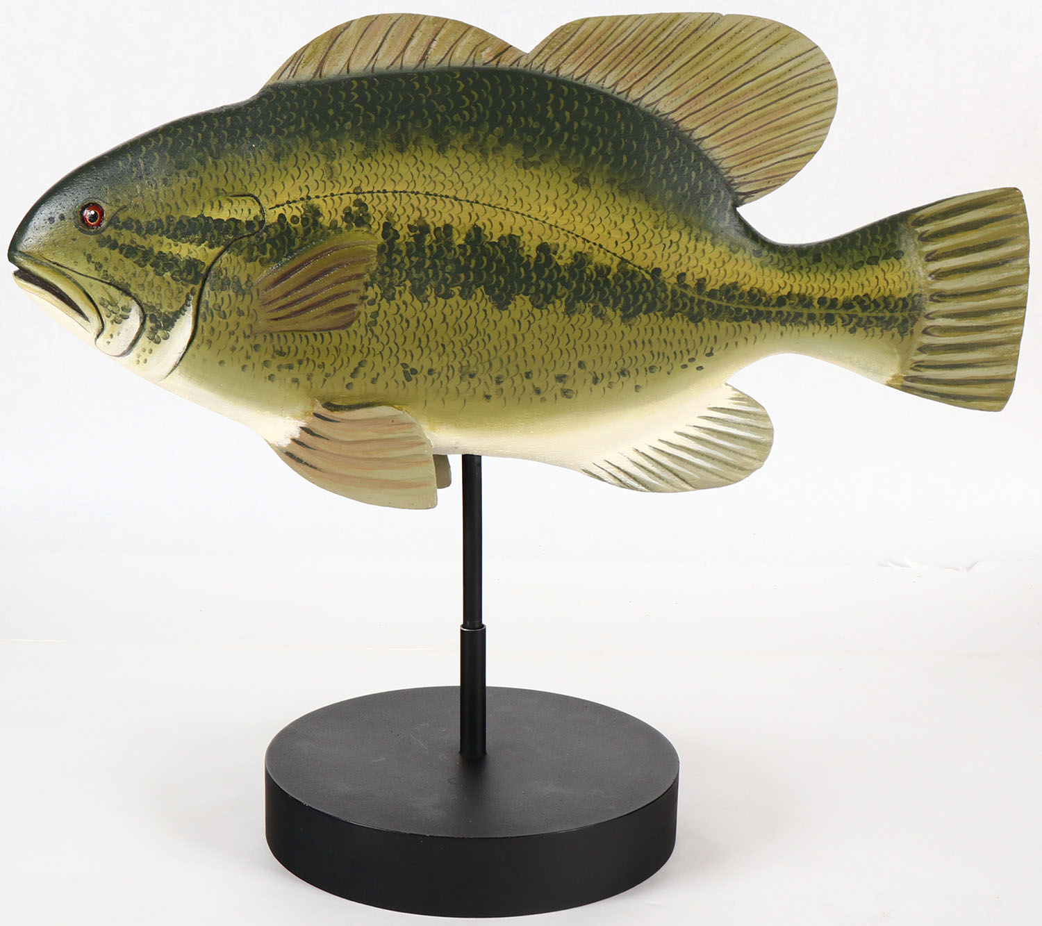Large Mouth Bass by Larry Rucker, Renton WA, PE solid wood hand carved & wonderfully hand painted, on stand, signed on bottom, 18'' OAL, Grade: Excellent ++ - Value: 50 to 100