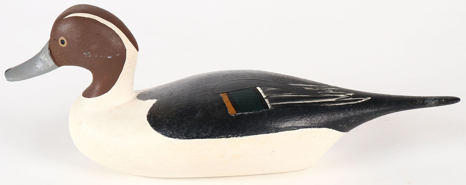 Miniature Pintail Drake by Steven R Lay, Havre de Grace, MD, PE, solid wood, original paint, signed on bottom, 10'' OAL. Grade: Excellent ++ - Value: 30 to 100