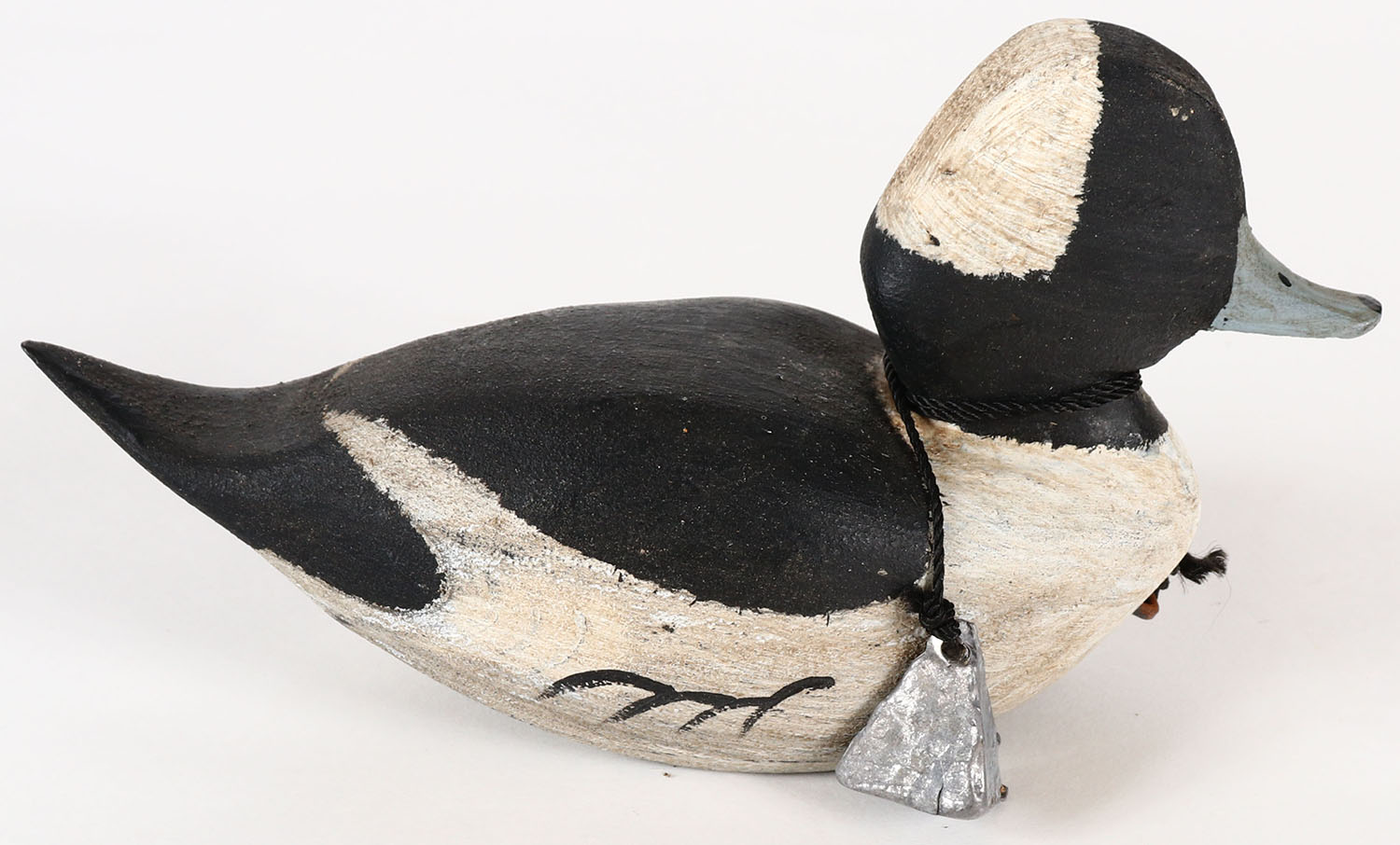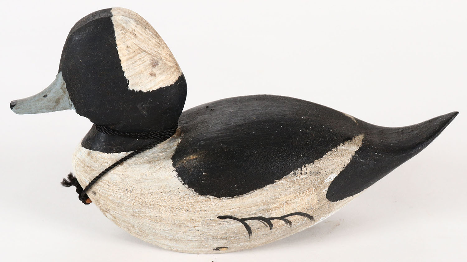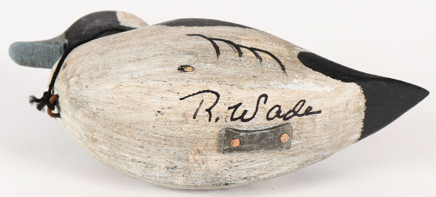 Miniature Bufflehead Drake by R, Wade, no eye, solid wood, original paint, signed on bottom, 6 1/4'' OAL. Grade: Excellent ++ - Value: 10 to 50