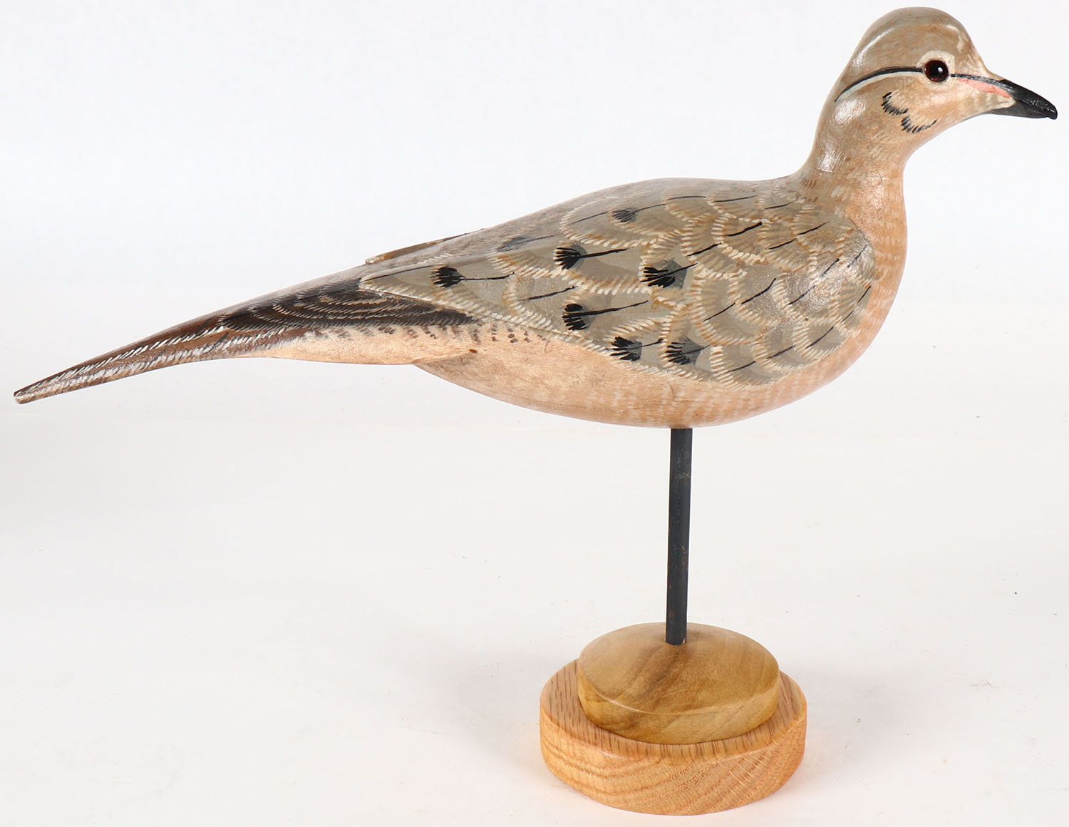 Morning Dove by Stor Johann, signed on decoy & stand on bottom, GE, solid wood, mint original paint, 11 1/2'' OAL. Grade: MINT - Value: 20 to 60