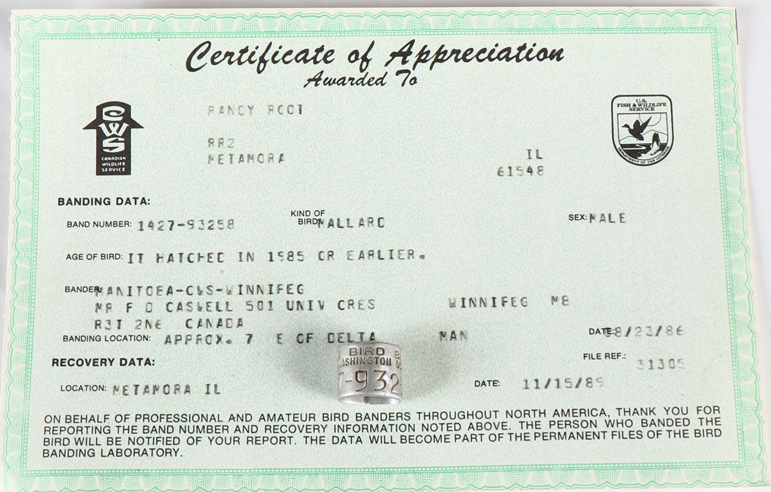 DUCK BAND 4 YEAR OLD BIRD, with certificate from 1986 we are offering a few duck bands that were all shot at one duck club in Peoria IL from 1964 - 1999, ''MALLARD FARMS R R 2'', this one has a certificate, this one was banded Approx. 7 miles E Cf Delta MAN 08/22/86 and shot 11/15/89. Grade: Excellent - Value: 40 to 100