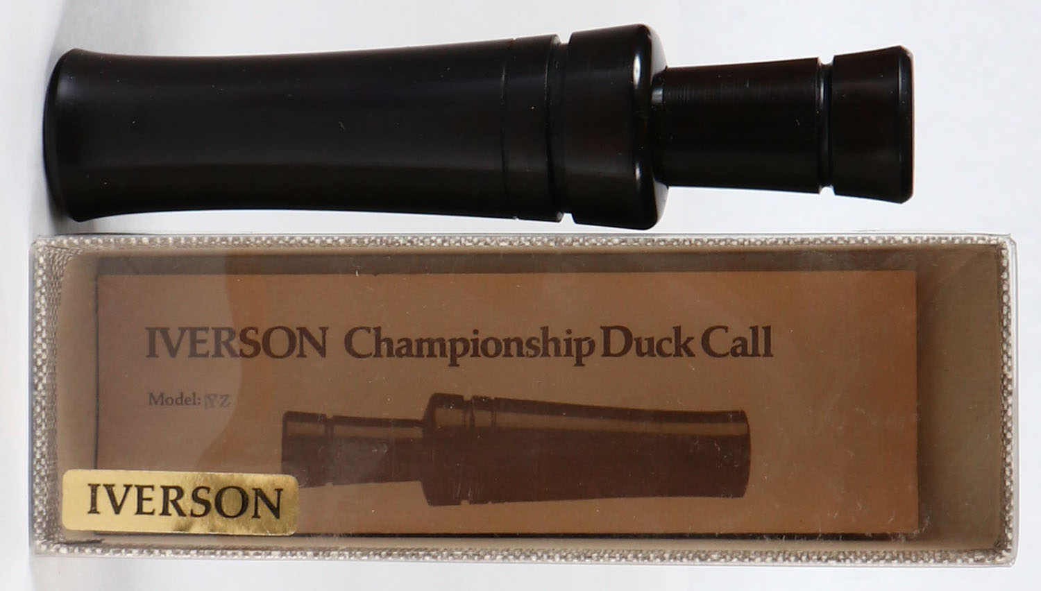 Iverson Duck call in original box, Model yz?, has paper work, Rosewood barrel & stopper, sounds great. Grade: Excellent ++ - Value: 100 to 300