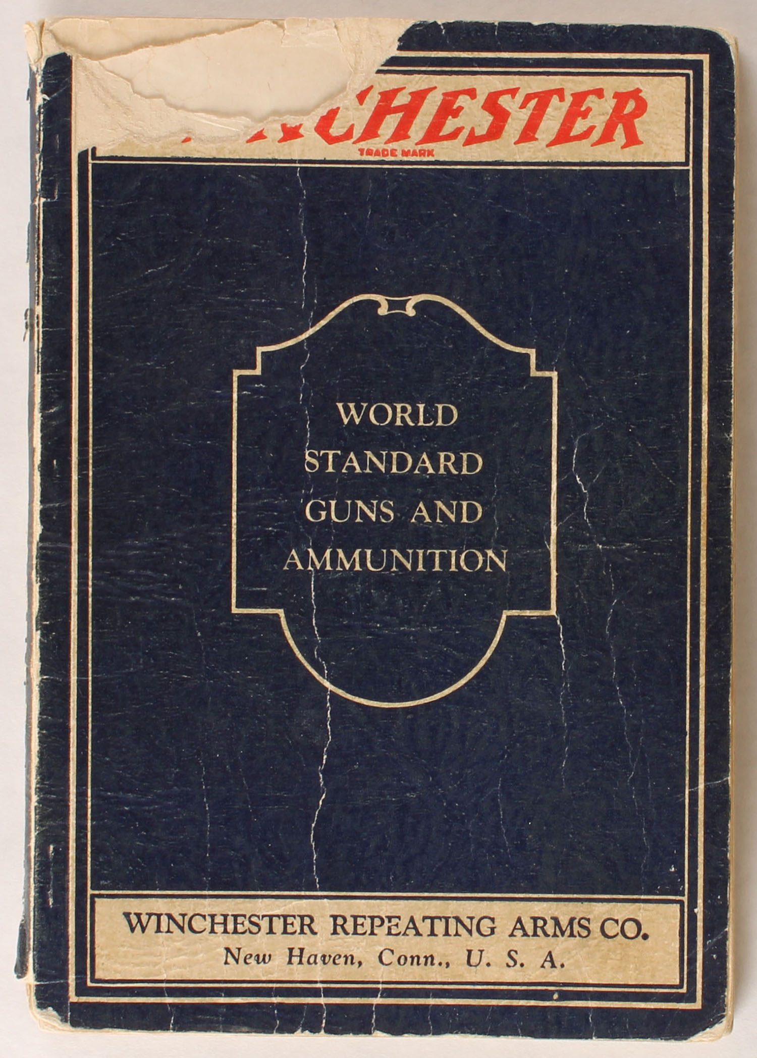 Winchester World Standard Guns and Ammuntion Handbook, 1923, 6'' x 8'', 127 pages, pages clean, staple bound , cover separated from binding, papercover is ripped on top left corner, some edge wear and light age soiling. Value: $60. Grade: Good - Value: 10 to 60