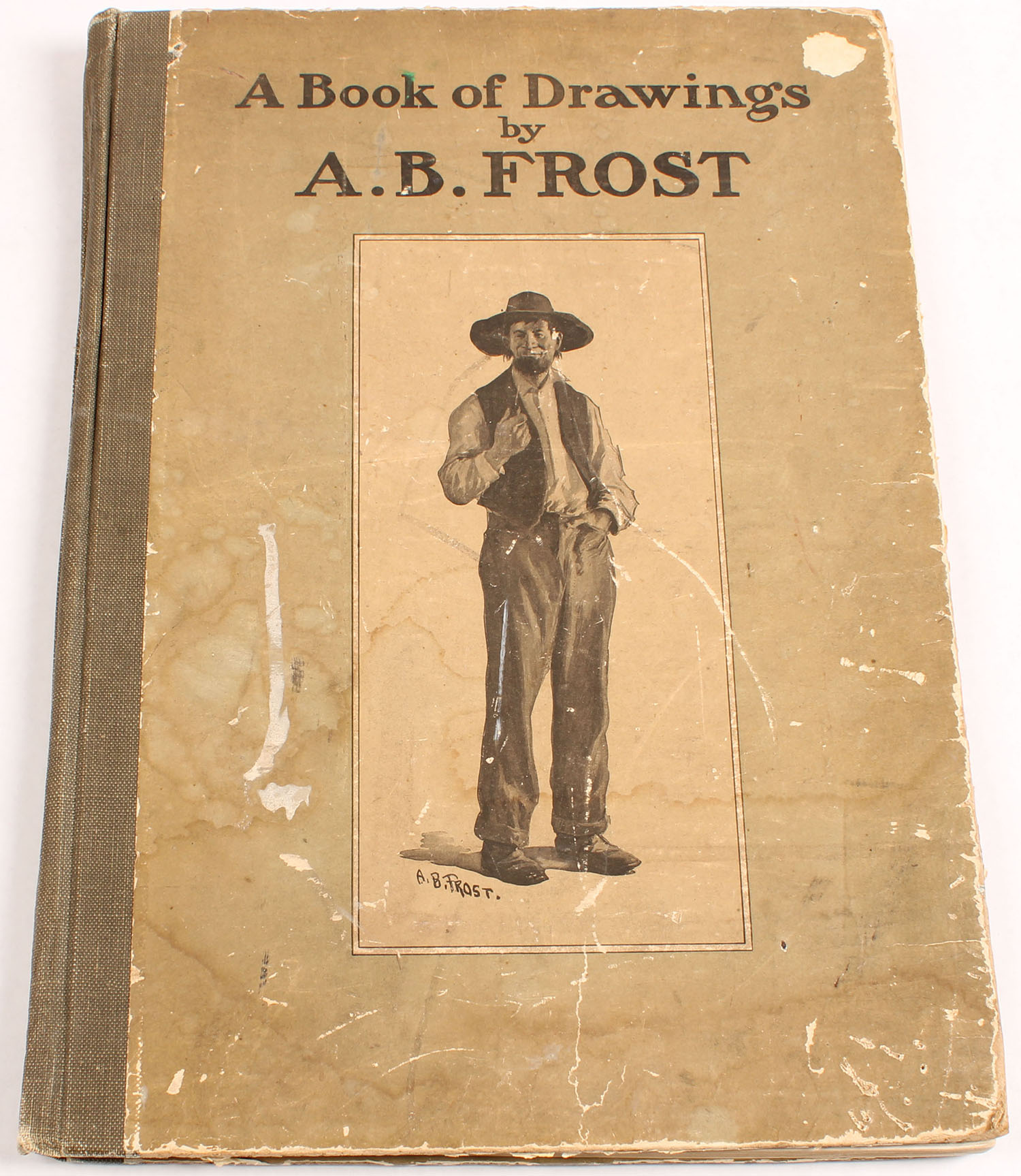 A Book of Drawings by A B Frost 1904. 11'' x 15 1/2'', 40 illustrations with corresponding write ups, b/w photos, pages clean, binding loose, hardcover good with wear all along edges, hardcover shows aging and soiling. Grade: Good - Value: 10 to 50