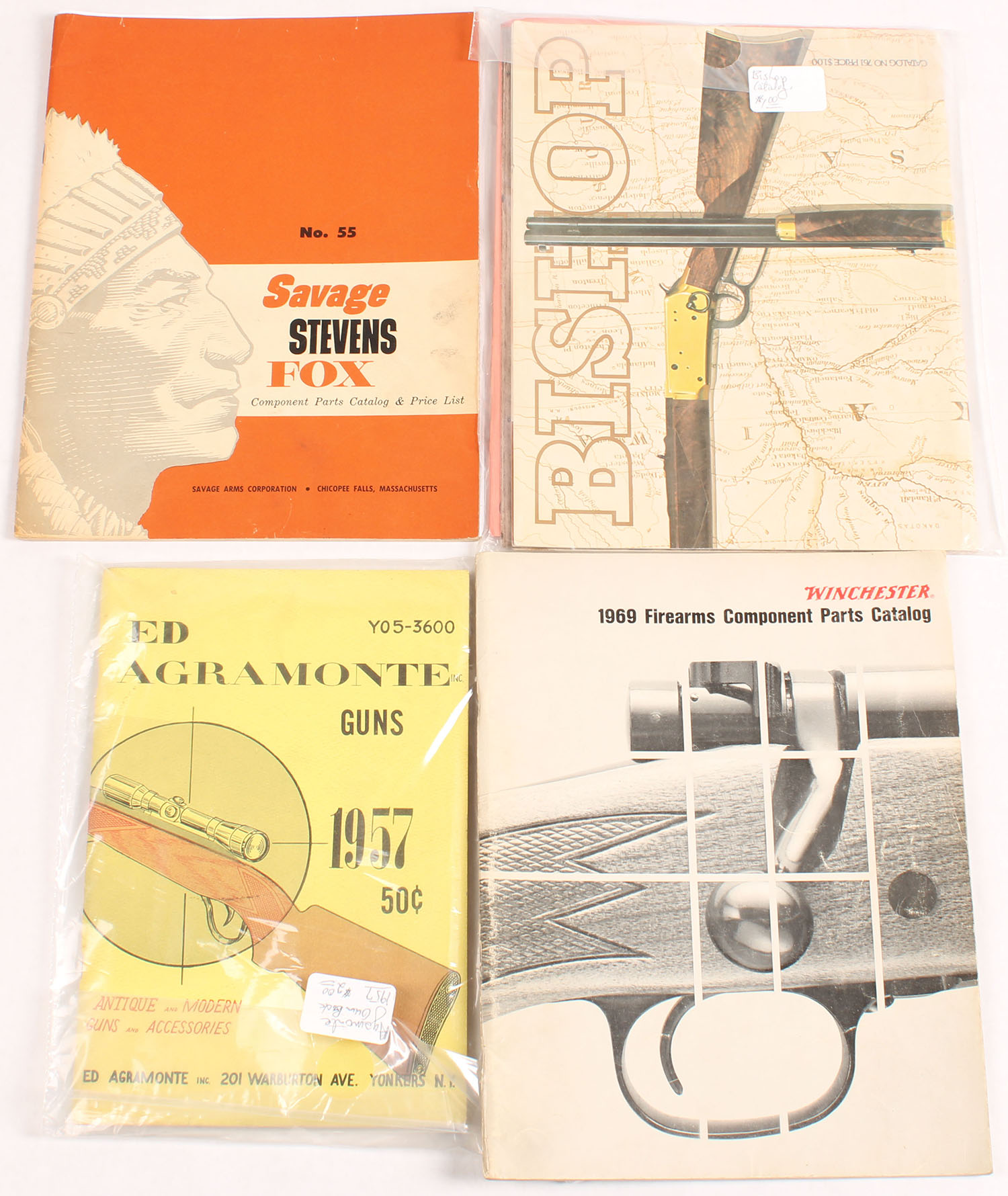 Lot of 4 Manufactures Gun and Parts Catalogs. (1) Ed Agramonte Guns 1957. 6 1/2'' x 10'', 95 pages, pages clean, binding tight, b/w photos, paper cover good with some age soiling. (2) Bishop Gun Catalog No. 761. 8 1/2'' x 11', colored photos, pages clean, binding tight. (3) Savage Stevens Fox Component Parts Catalog & Price List No. 55. 8 1/2'' X 11'', 65 pages, b/w photos, pages clean, binding tight, paper cover good with age soiling. (4) Winchester 1969 Firearms Component Parts Catalog. 8 1/2'' x 11'', 64 pages, b/w photos, pages clean, binding tight, paper cover Good. Grade: Good ++ - Value: 5 to 100