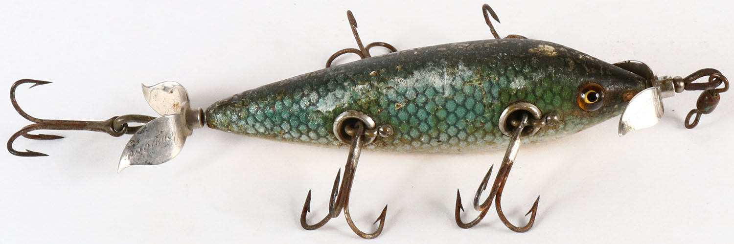 Heddon 150 DOWAGIAC MINNOW, 5 hook lure, Green Scale finish, has glass eyes, shows wear to sides of paint. Grade: Very Good - Value: 20 to 60