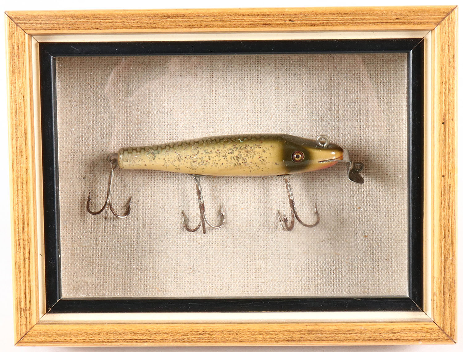 Creek Chub Pikie, wood lure, GE, cream & green with gold fleck, 3 hooks, marked metal lip, Cup rig, in shadow box, 4 1/2''. Grade: Excellent ++ - Value: 10 to 40