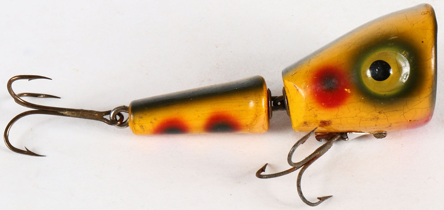 South Bend GOPLUNK, no eyes, wood lure with strawberry finish, 2 hooks, unmarked. Grade: Very Good ++ - Value: 10 to 40
