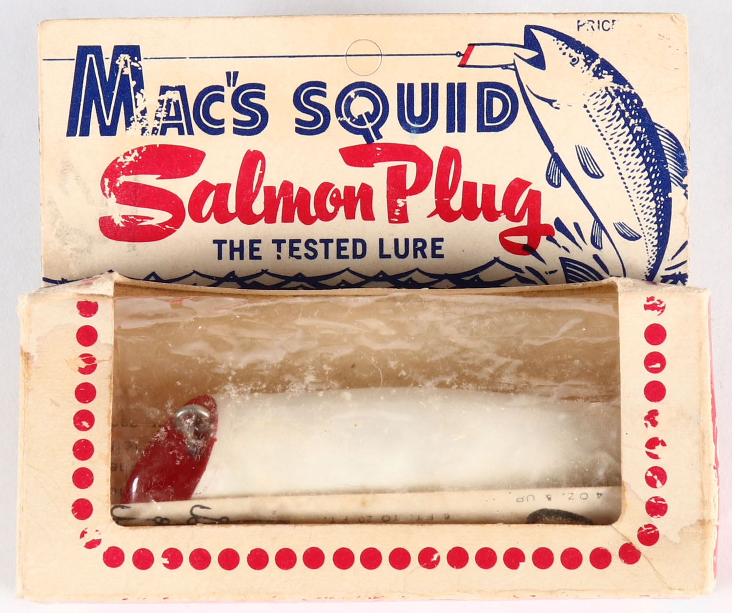 Mac's Squid Salmon Plug in the original box, white & red. Grade: Excellent - Value: 2 to 40