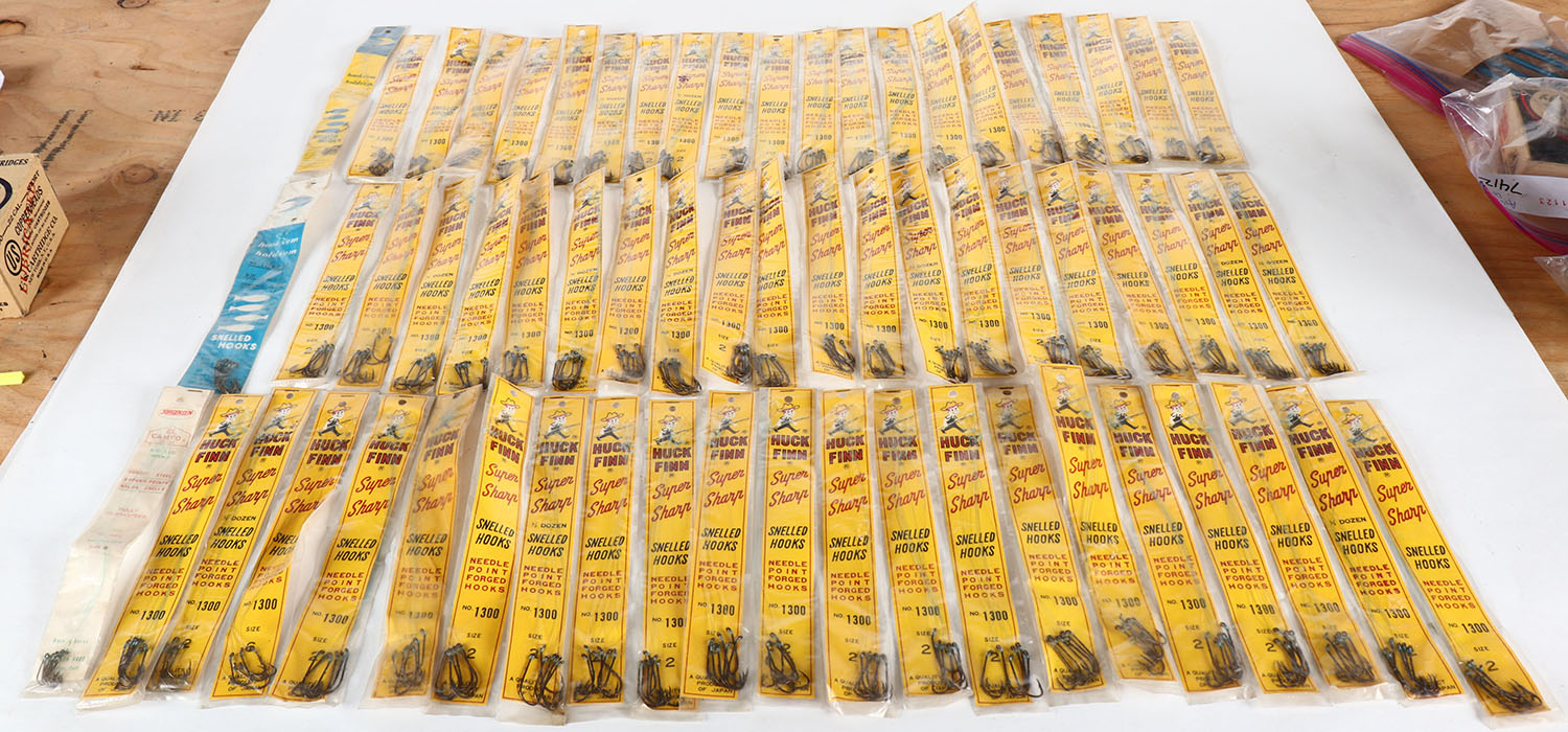 Large Lot of Huck Finn fishing hooks with leader on cards. Grade: Excellent - Value: 10 to 60