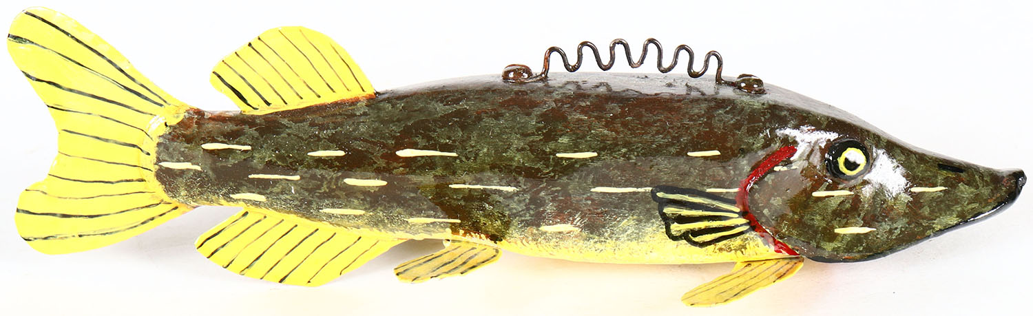 Sturgeon Ice Fishing decoy marked CA on bottom, PE, has metal fins, 7'' OAL. Grade: Excellent ++ - Value: 20 to 100