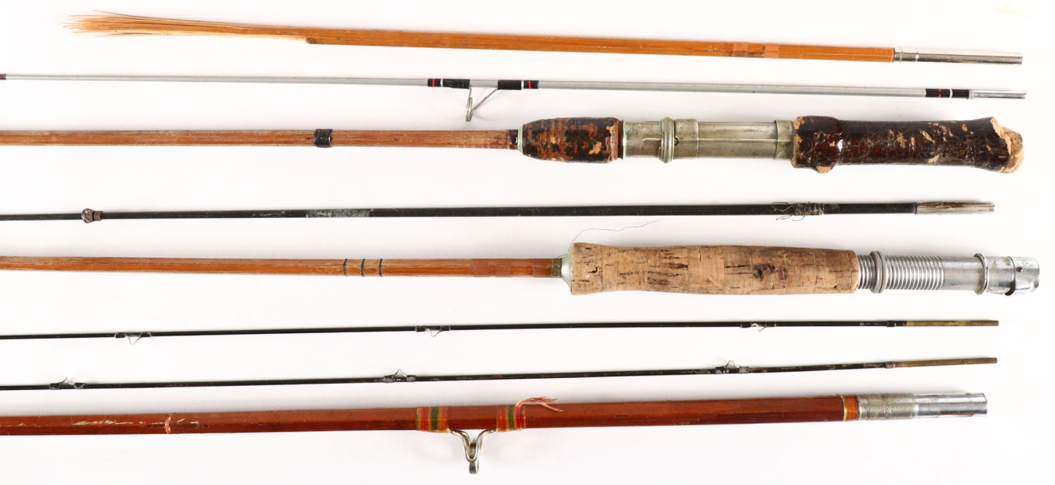 Lot of 3 Bamboo & steel fishing rods sections, parts lot, including a Winchester. Grade: Good - Value: 2 to 20