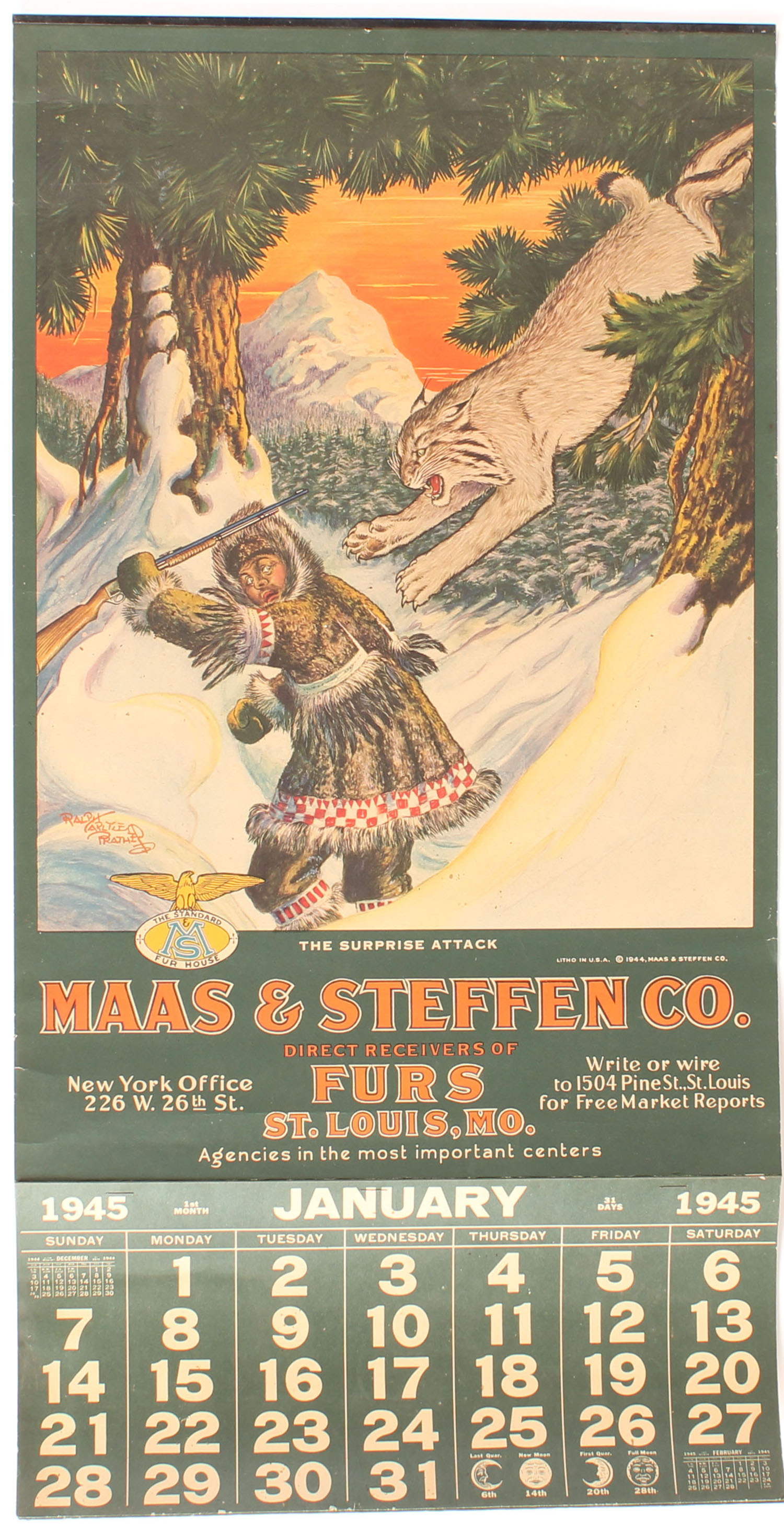 Maas & Steffen 1945 Calendar, ''THE SUPRISE ATTACK'', pictures lynx's attacking an Eskimo in snow mountain scene, 13 1/2'' x 26 3/8'', has original band with paper hanger, shows some edge wear & a tape repair to right side, FULL pad of pages, has very nice color with beautiful image. Grade: Excellent - Value: 800 to 2000