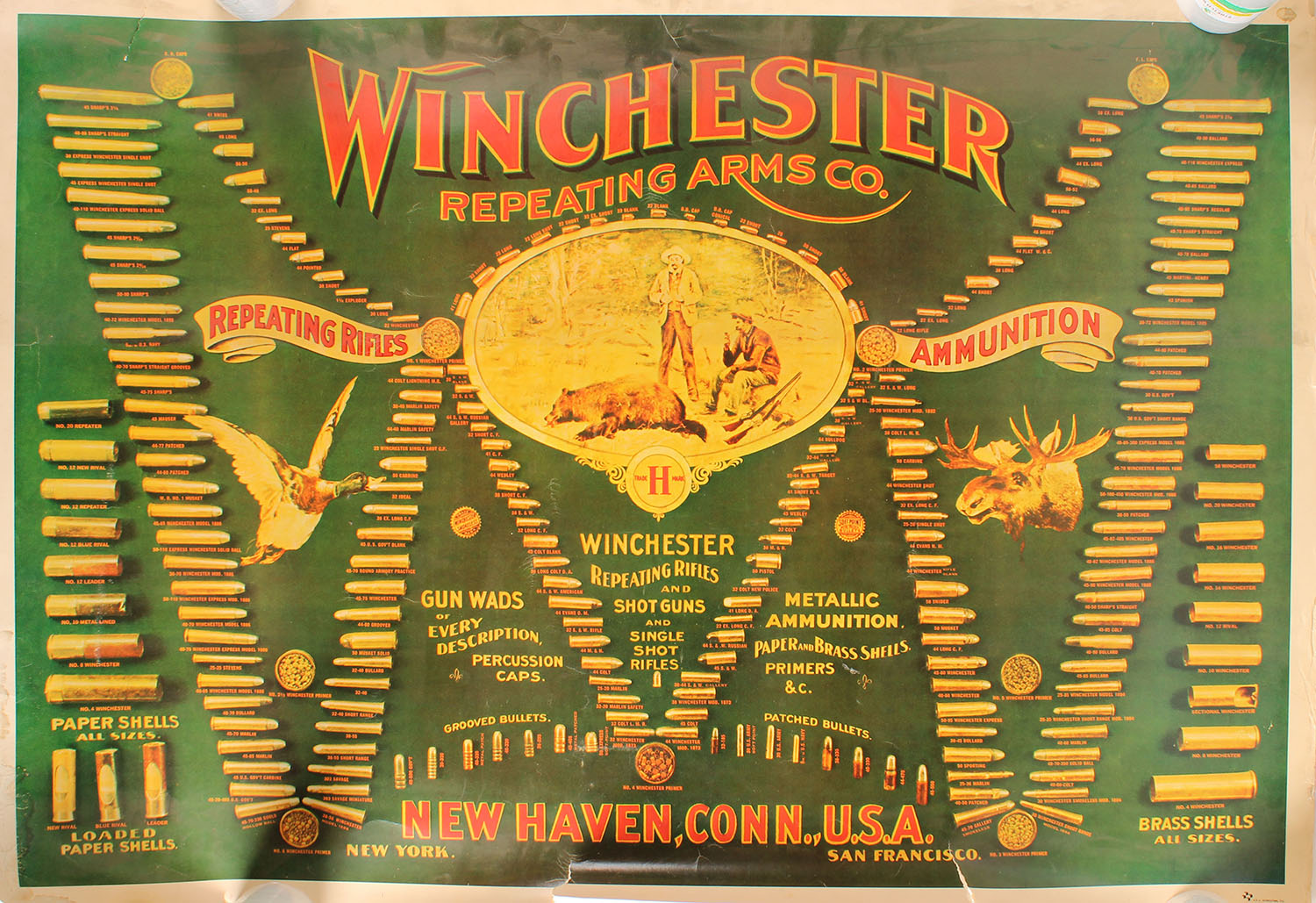Winchester Double W Cartridge Board Litho, this heavy paper litho pictures all cartridges, this is a 1970's reproduction, this one has 9 more cartridges than the 1897 board, pictures bear hunting scene in center vinaigrette, mallard & bull moose, 52'' x 36'', shows light edge wear & light soiling. Grade: Very Good ++ - Value: 800 to 800