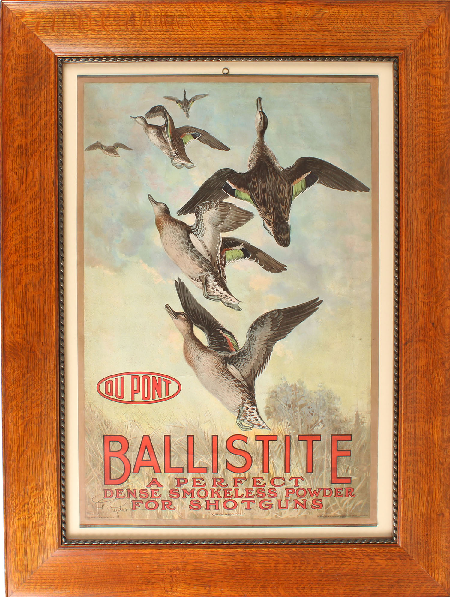 RARE DUPONT BALLISTITE Poster pictures Green-wing Teal in flight, dated 1913, has metal bands top & bottom with brass hanger, has been professional touched up in some places, wonderful full color image with teal up close & flying straight up, 20'' x 30 1/4'', framed, Rare & hard to find! Grade: Excellent - Value: 1500 to 3000