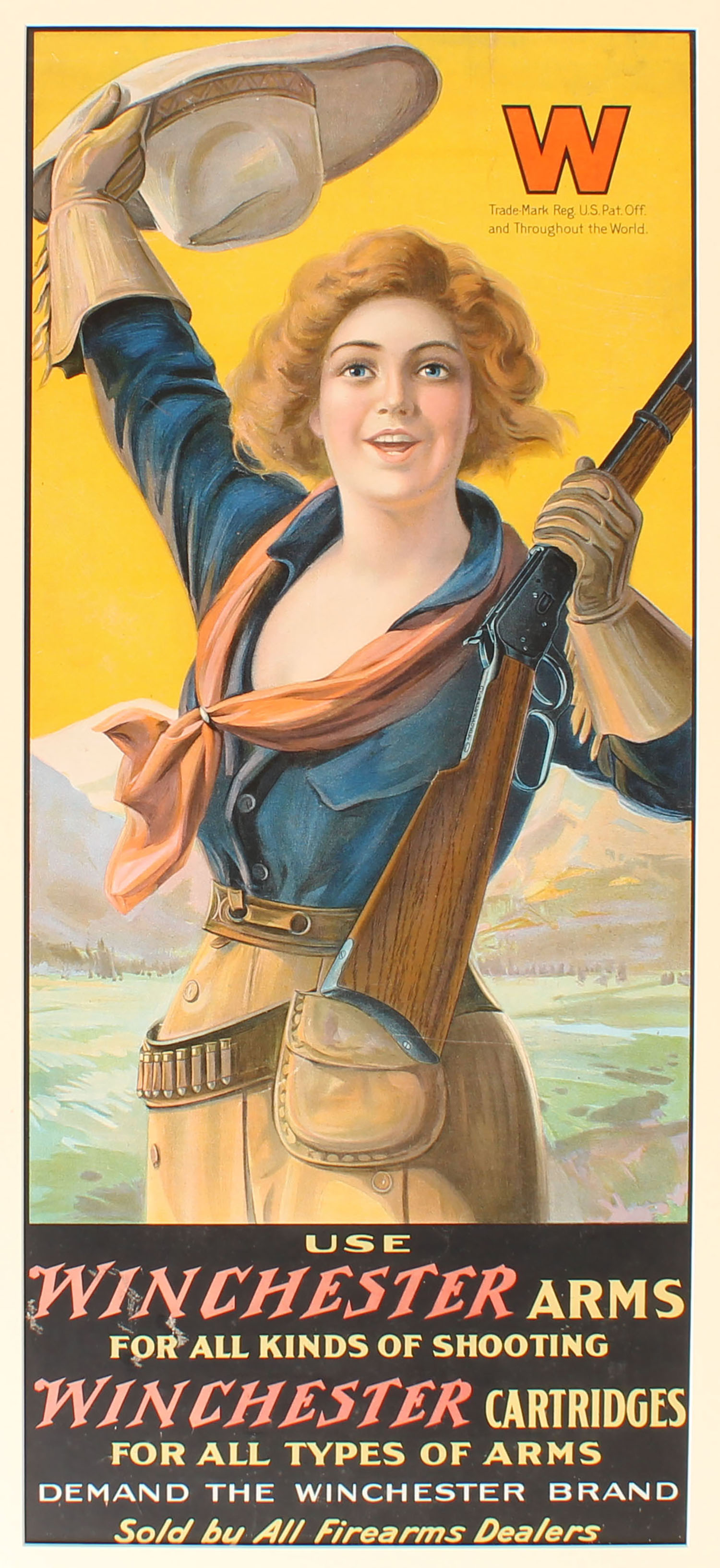 Extremally Rare Winchester poster pictures Woman standing with a cowboy hat & rifle, ONLY four examples are known to exist in English & two in Spanish, unfortunately this one has no bands & is glued on to a board, 14'' x 30 1/4'', only 1 1/4'' have been cut off top to bottom, matted, has two minor tears before it was glued down, the image is crystal clear with great colors. Still a great center piece to any Winchester collection. This normally values at 8,000 - 12,000. Grade: Very Good ++ - Value: 1000 to 3000