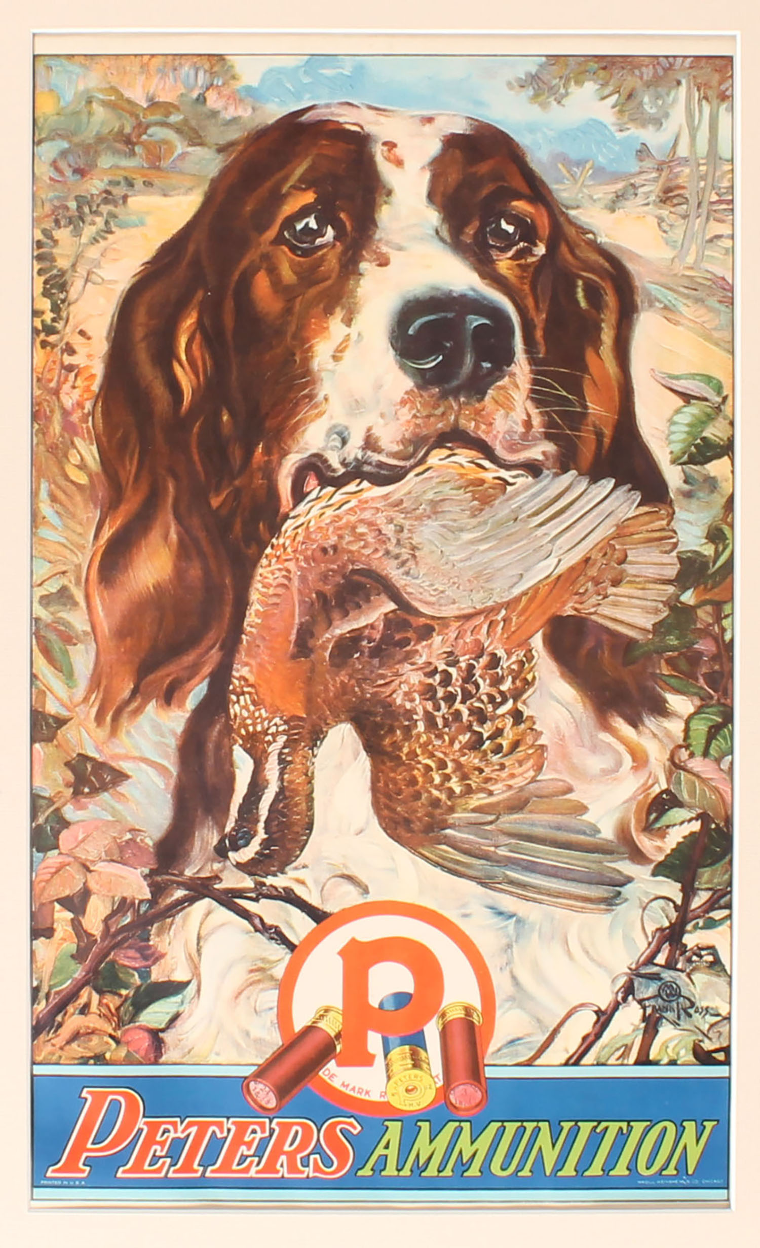 RARE Peters Ammunition Poster pictures great full color image of springer holding a Bob White Quail by Frank Ross, has METAL BANDS TOP & BOTTOM, no edge wear in perfect condition, FIRST ONE WE HAVE SEEN & EXTREMELY RARE! Grade: MINT - Value: 2000 to 3000