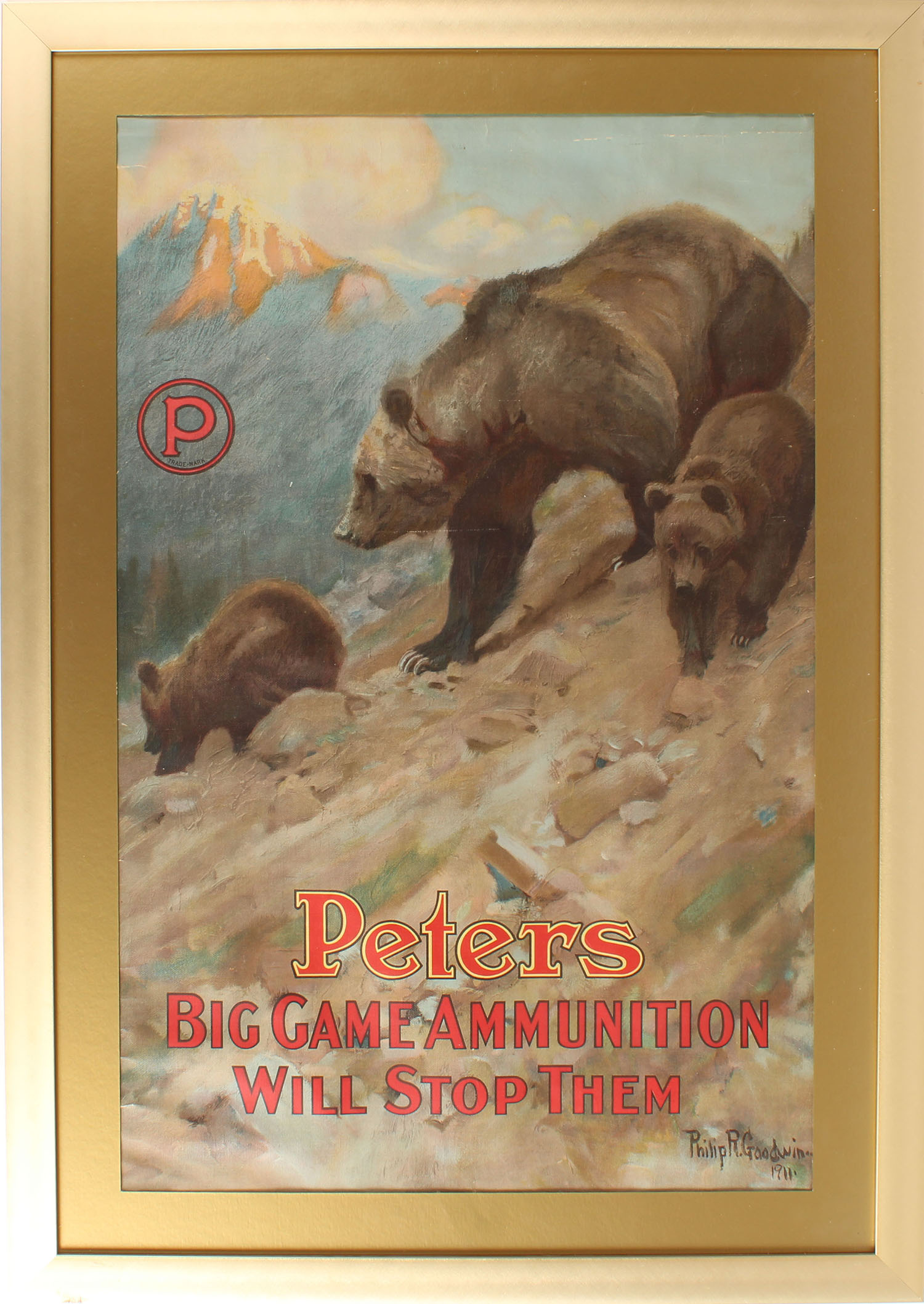 Peters Poster ''BIG GAME AMMUNITION WILL STOP THEM'', by Philip R Goodwin, has full color image of Grizzly Bear & two cubs with mountain scene in background, has metal bands on top and bottom with two brass hangers, 20 3/8'' x 30 1/4'', has great colors, all original, framed, HARD TO FIND. Grade: Excellent + - Value: 4000 to 6000