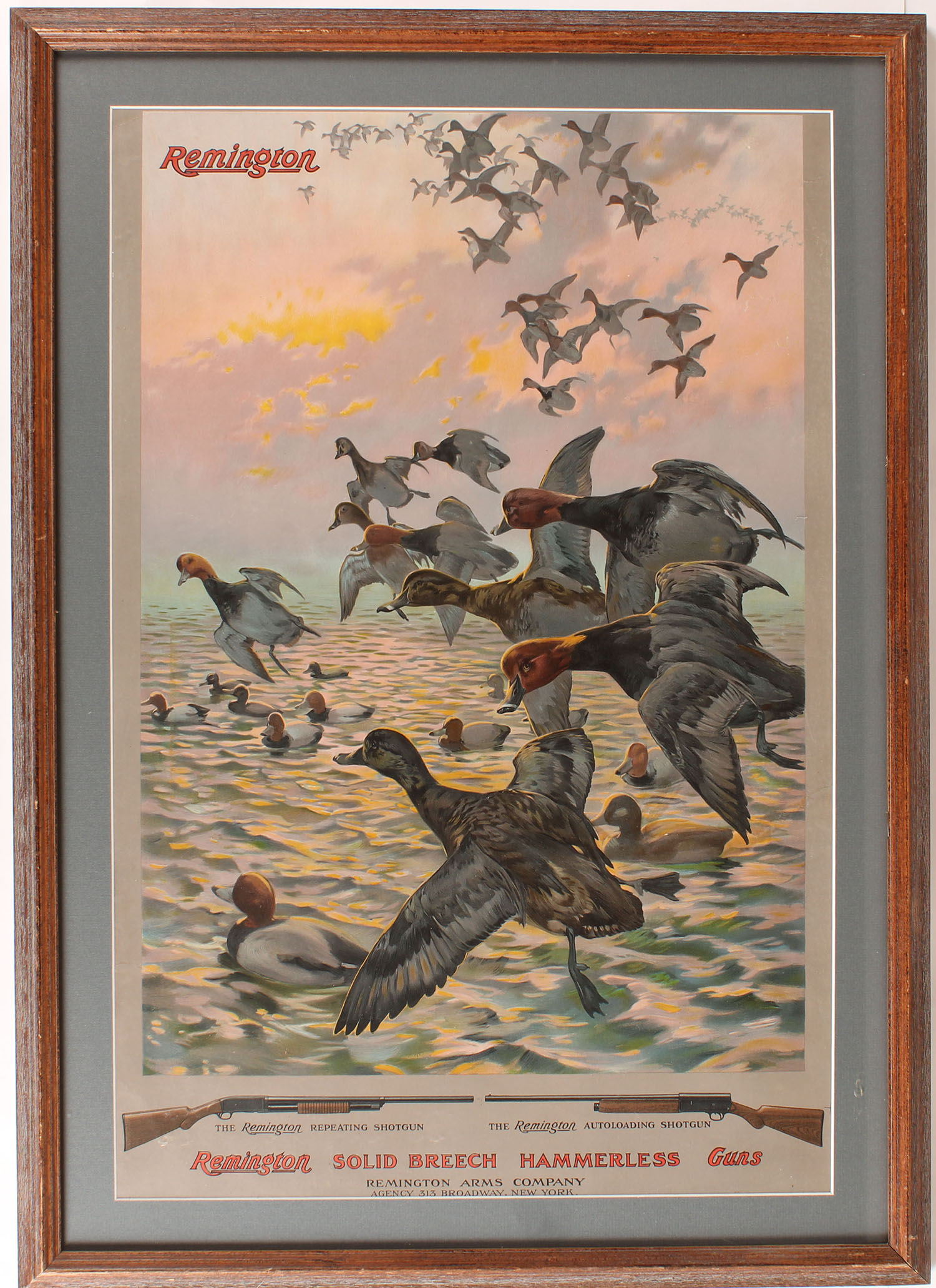VERY RARE Remington REDHEADS poster, circa 1908, has grand image of redheads in flight over decoys, 18 3/4'' x 28 1/2'', shows a few small edge tears otherwise fantastic colors, no bands, framed, VERY RARE! Grade: Excellent - Value: 500 to 2000