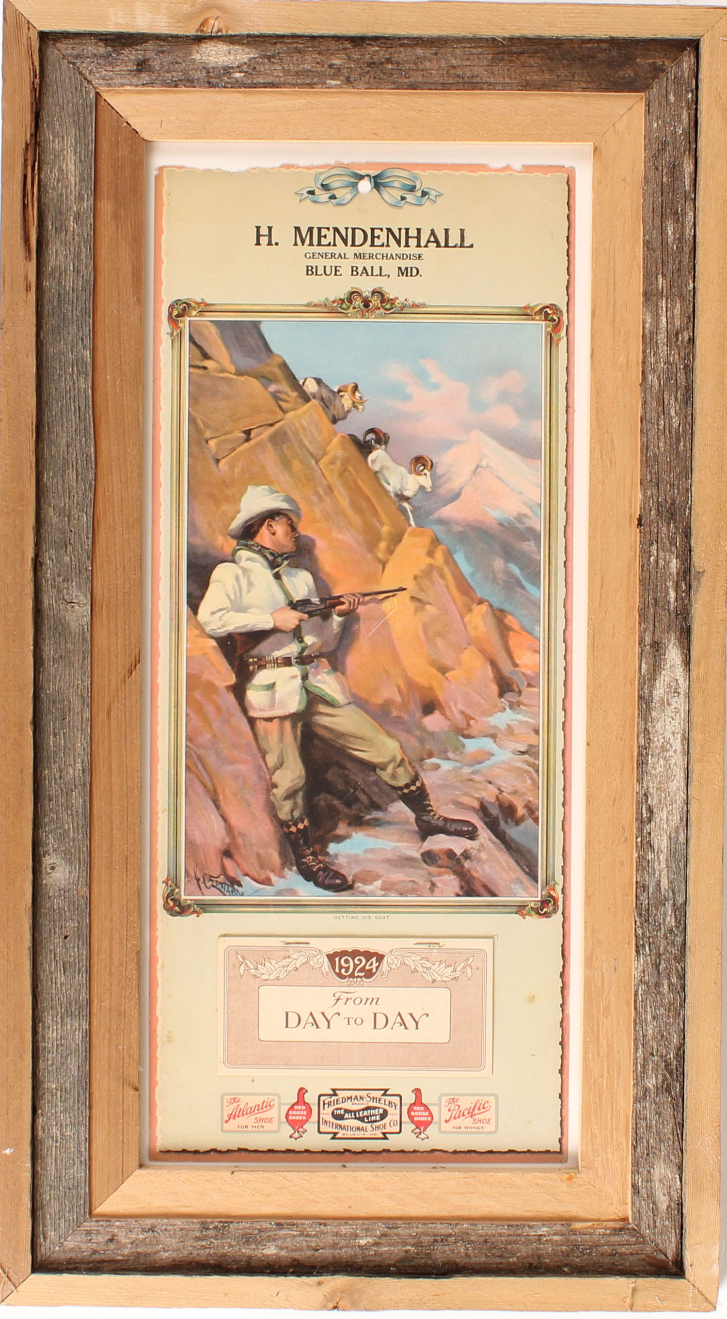 1924 Calendar pictures big horn sheep hunter hiding behind a cliff as the sheep come down, framed. Grade: Excellent - Value: 50 to 200
