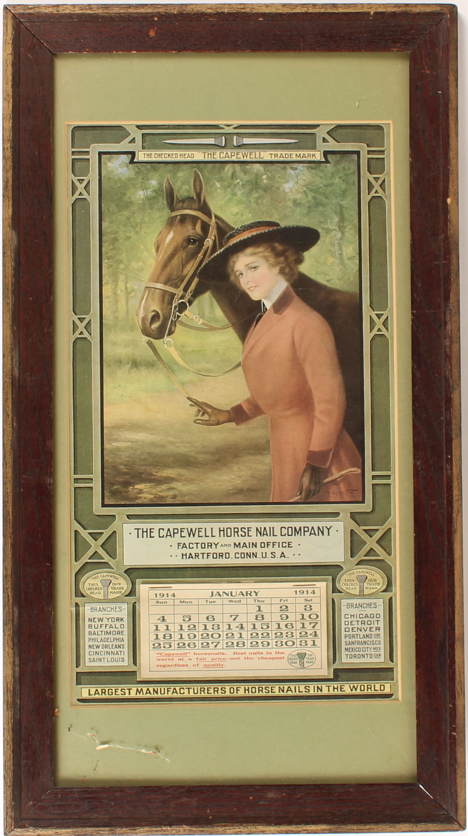 1914 Calendar pictures lady with horse, framed. Grade: Excellent - Value: 10 to 60