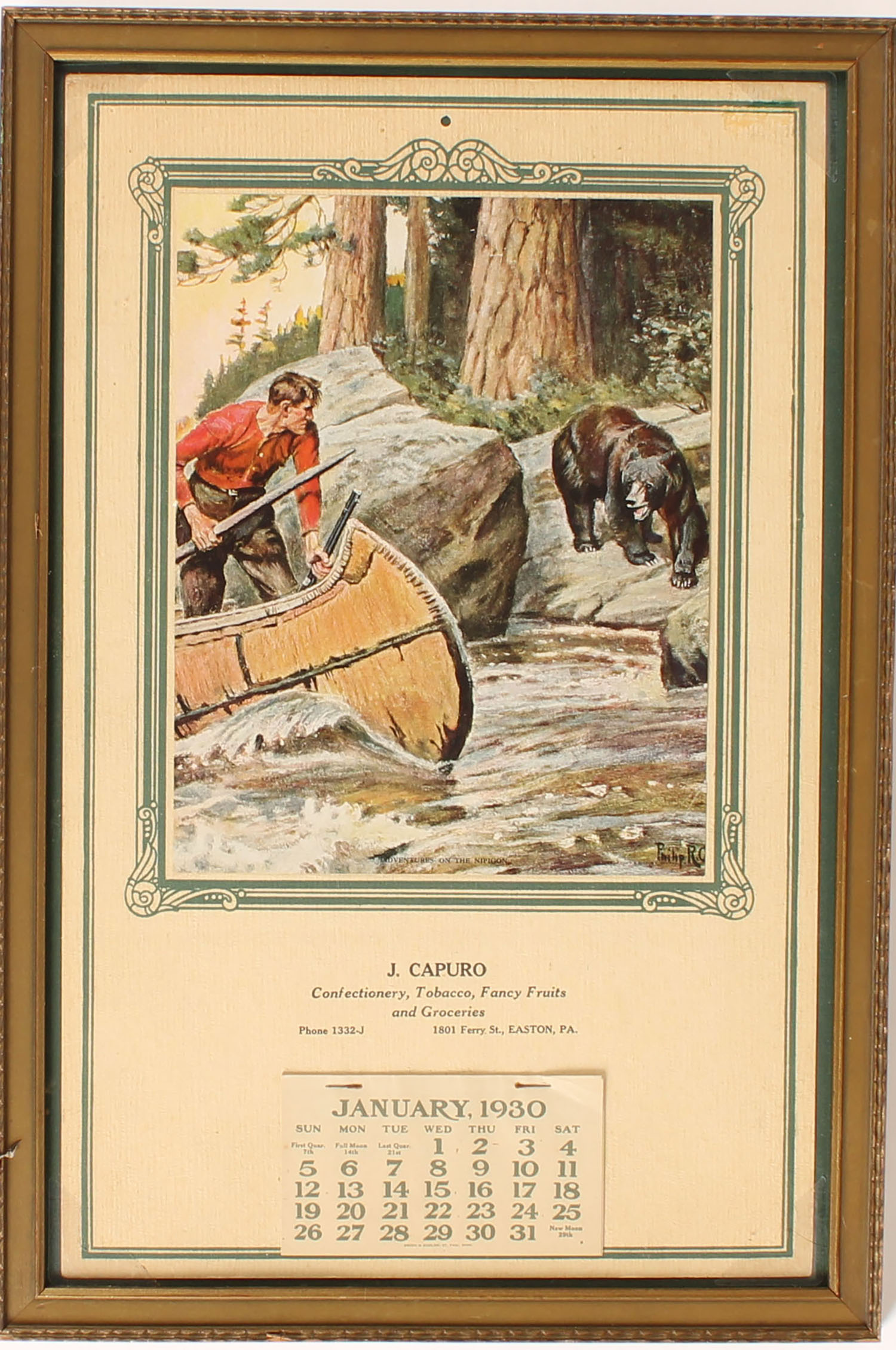 1930 Philip R Goodwin Calendar pictures hunter in canoe with black bear on the attack, framed. Grade: Excellent - Value: 50 to 200