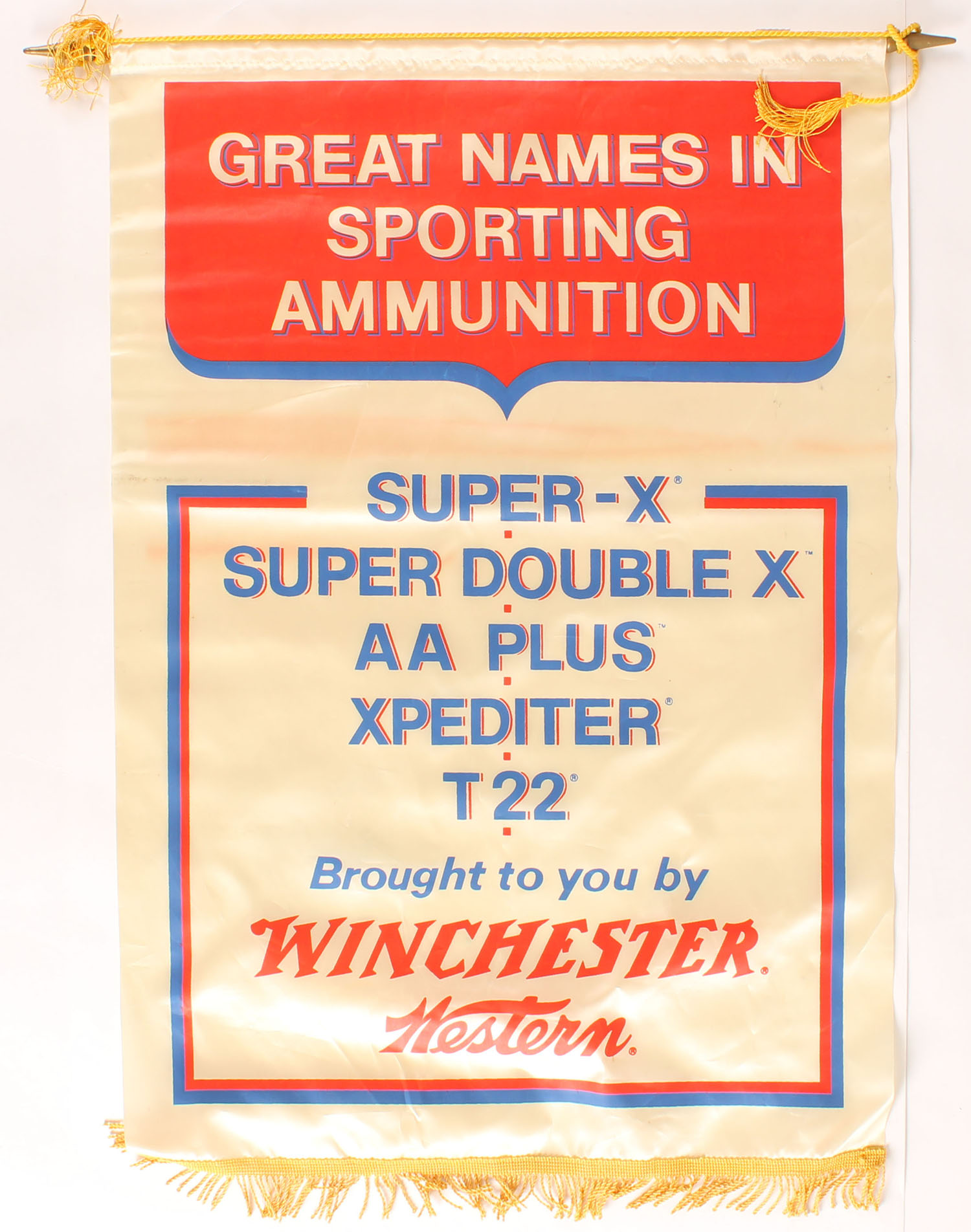 Winchester Western banner, ''GREAT NAMES IN SPORTING AMMUNTION'', red, white & blue, all complete, 22'' x 34''. Grade: MINT - Value: 40 to 120