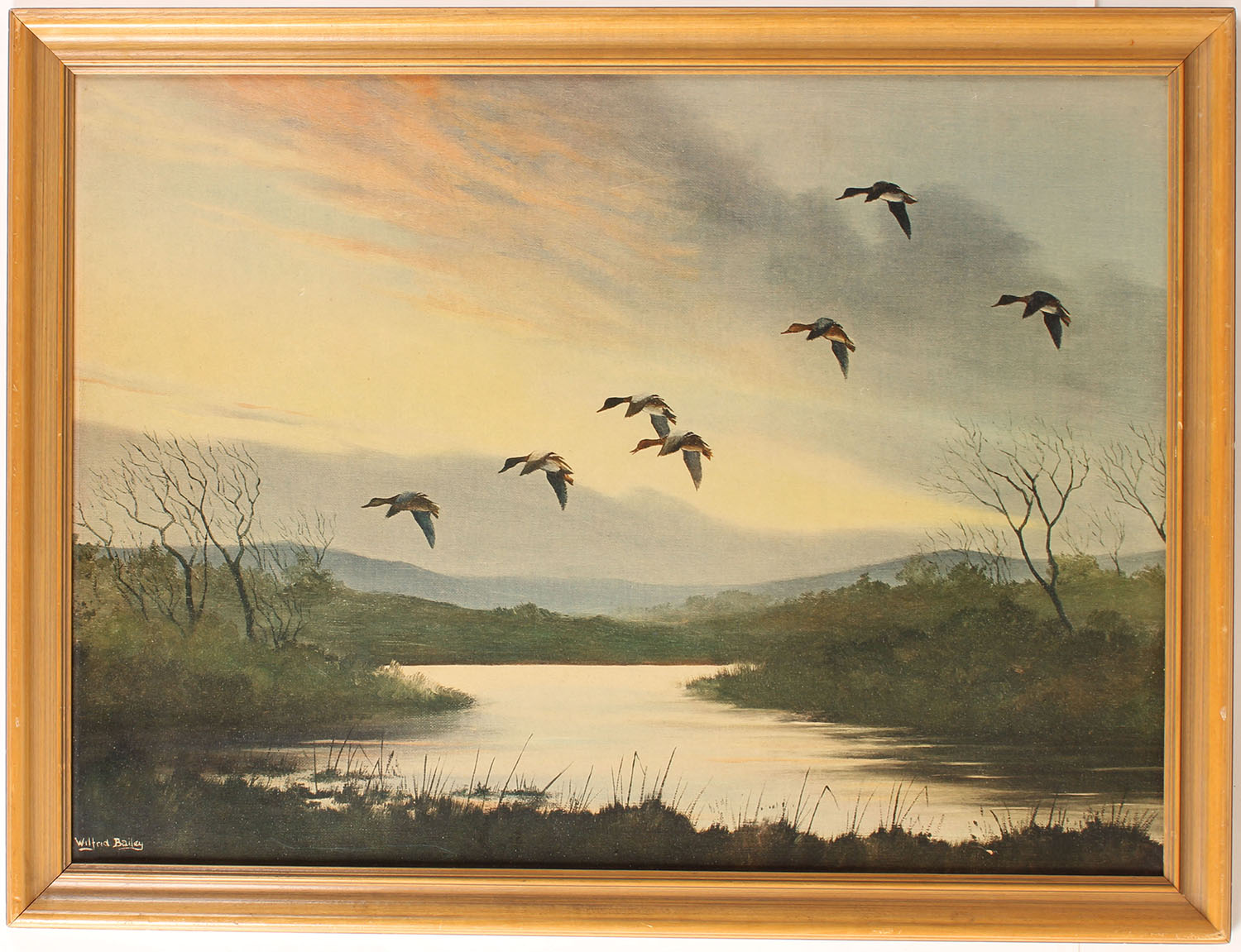 Wilfrid Bailey Print ''MALLARDS LANDING'', wonderful full color image of mallards landing into lake, image size 24'' x 18'', framed. Grade: Excellent - Value: 20 to 150