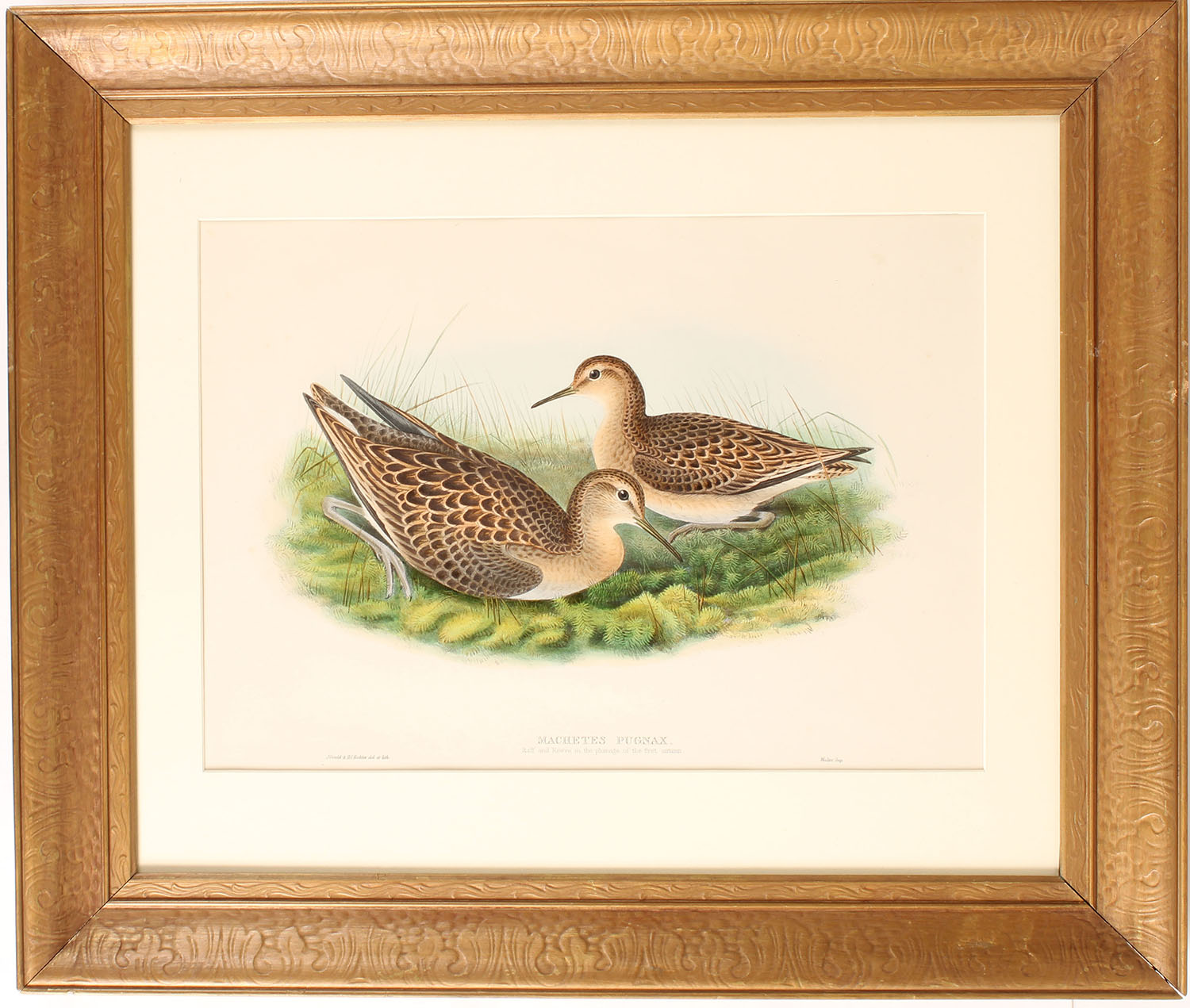 MACHETES PUGNAX print by J. Gould & H.C. Richter del et lith, pictures a wonderful full color image of two Ruff in plumage of the first autumn, marked Walter Imp. Image size 18'' x 13'', framed. Grade: Excellent - Value: 20 to 250