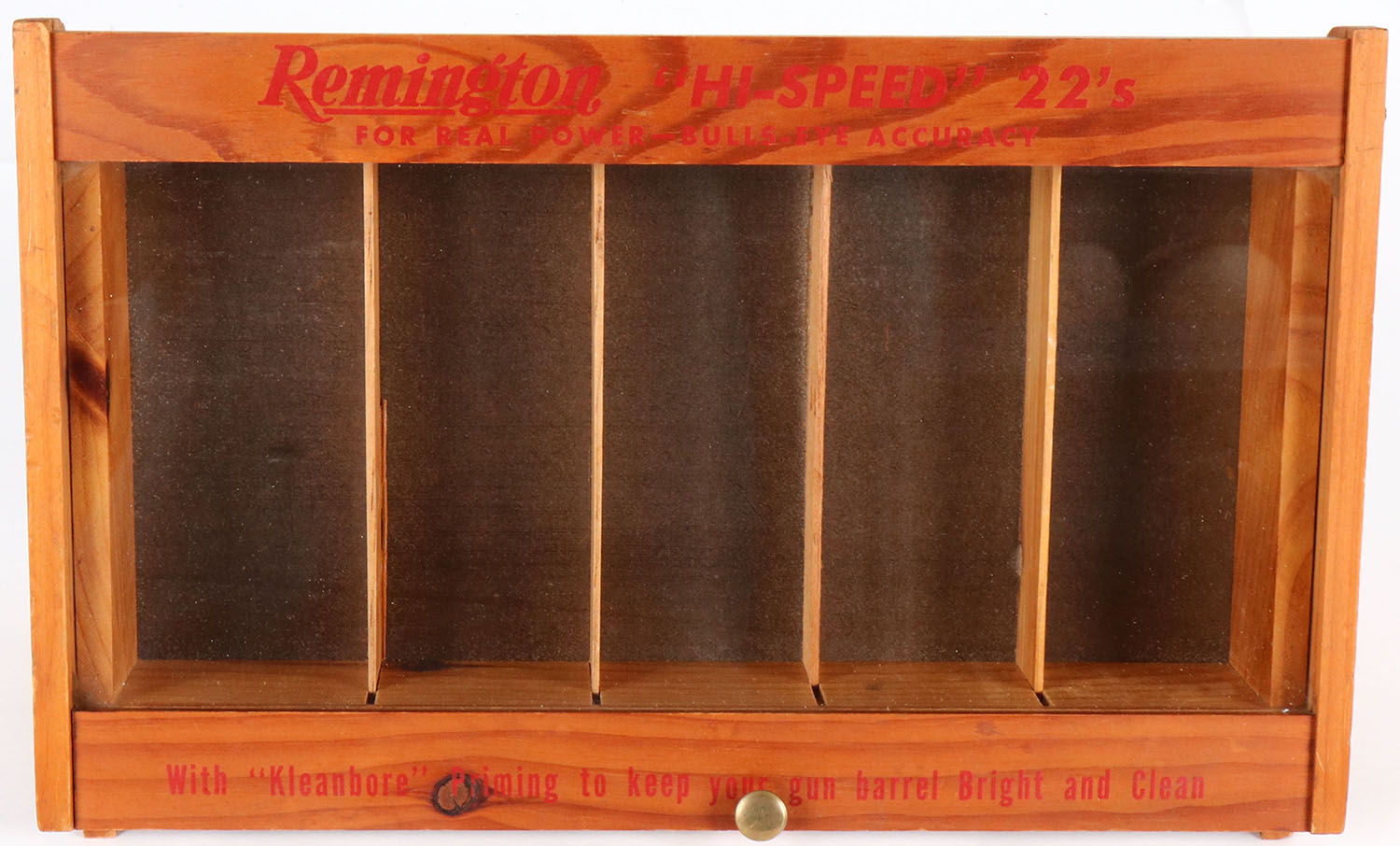 Remington HI-SPEED 22's display, wood is solid with great color, wood lock piece functions, red print has nice color, has reproduction cardboard top display. Grade: Excellent + - Value: 300 to 600