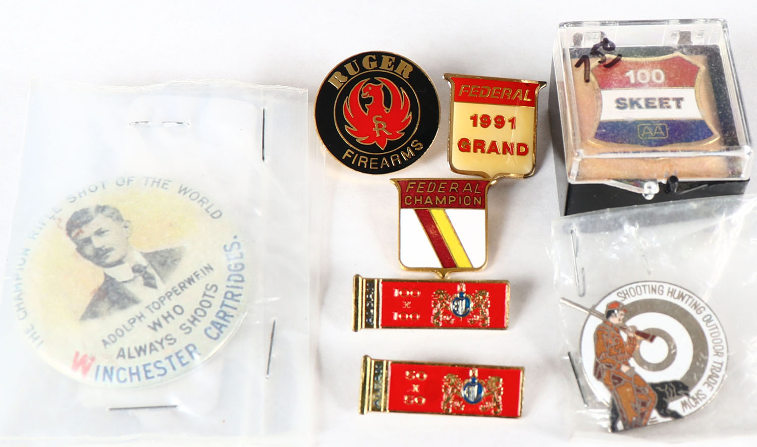 Lot of skeet shooting pinbacks, the Win. pinback is a repo. Grade: Very Good ++ - Value: 4 to 40