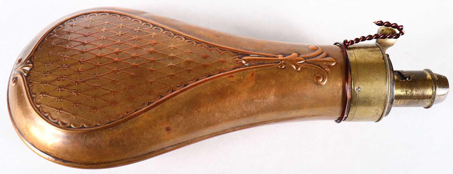 Brass Powder flask, unmarked with beautiful design, has age soiling Grade: Very Good - Value: 20 to 60